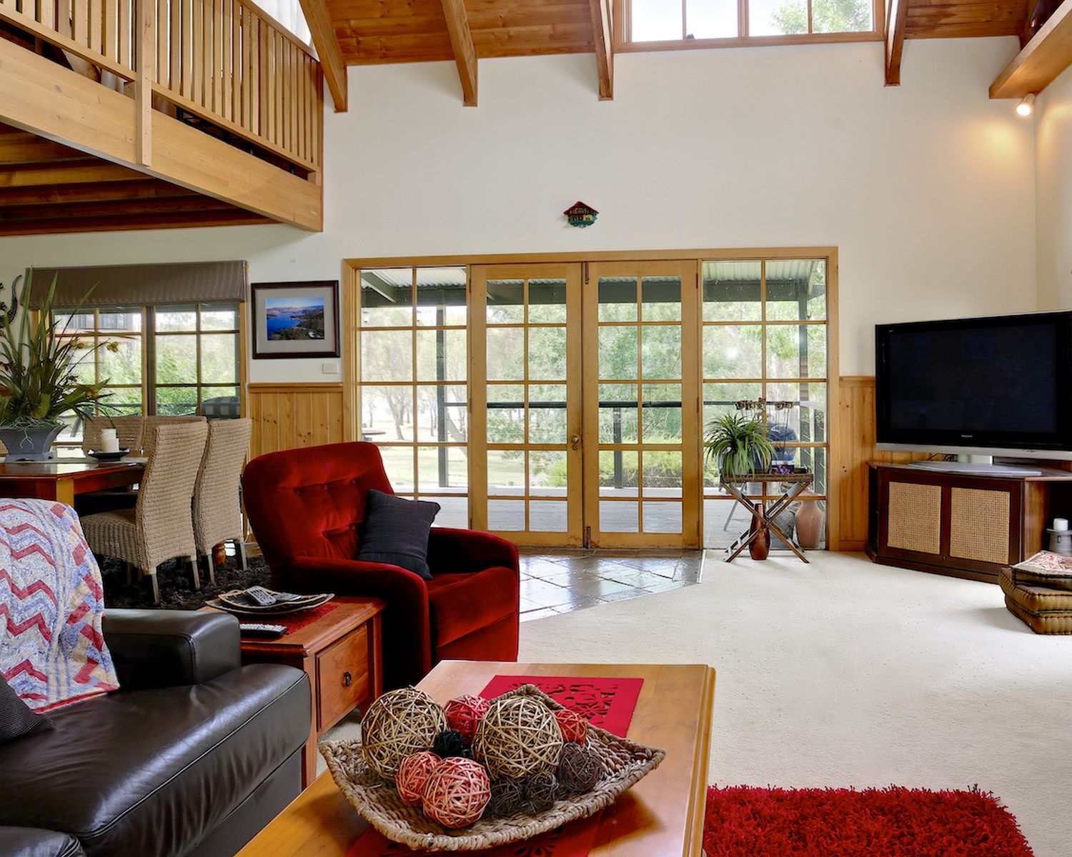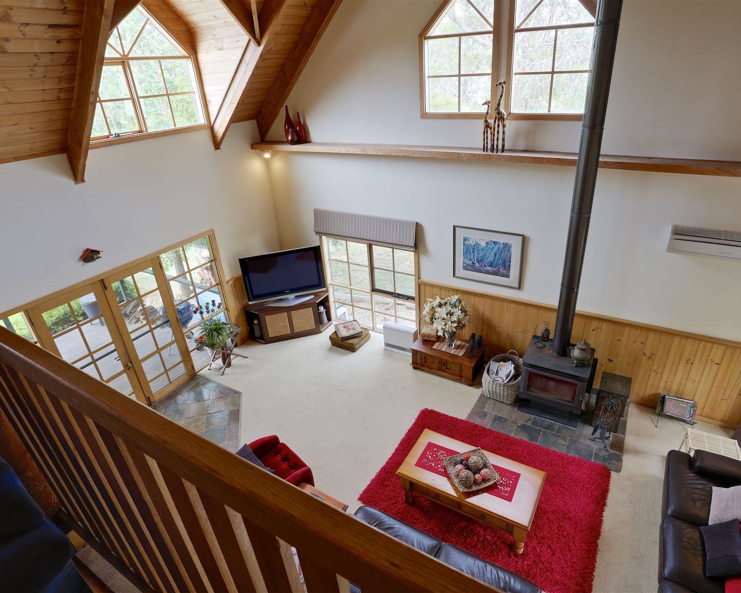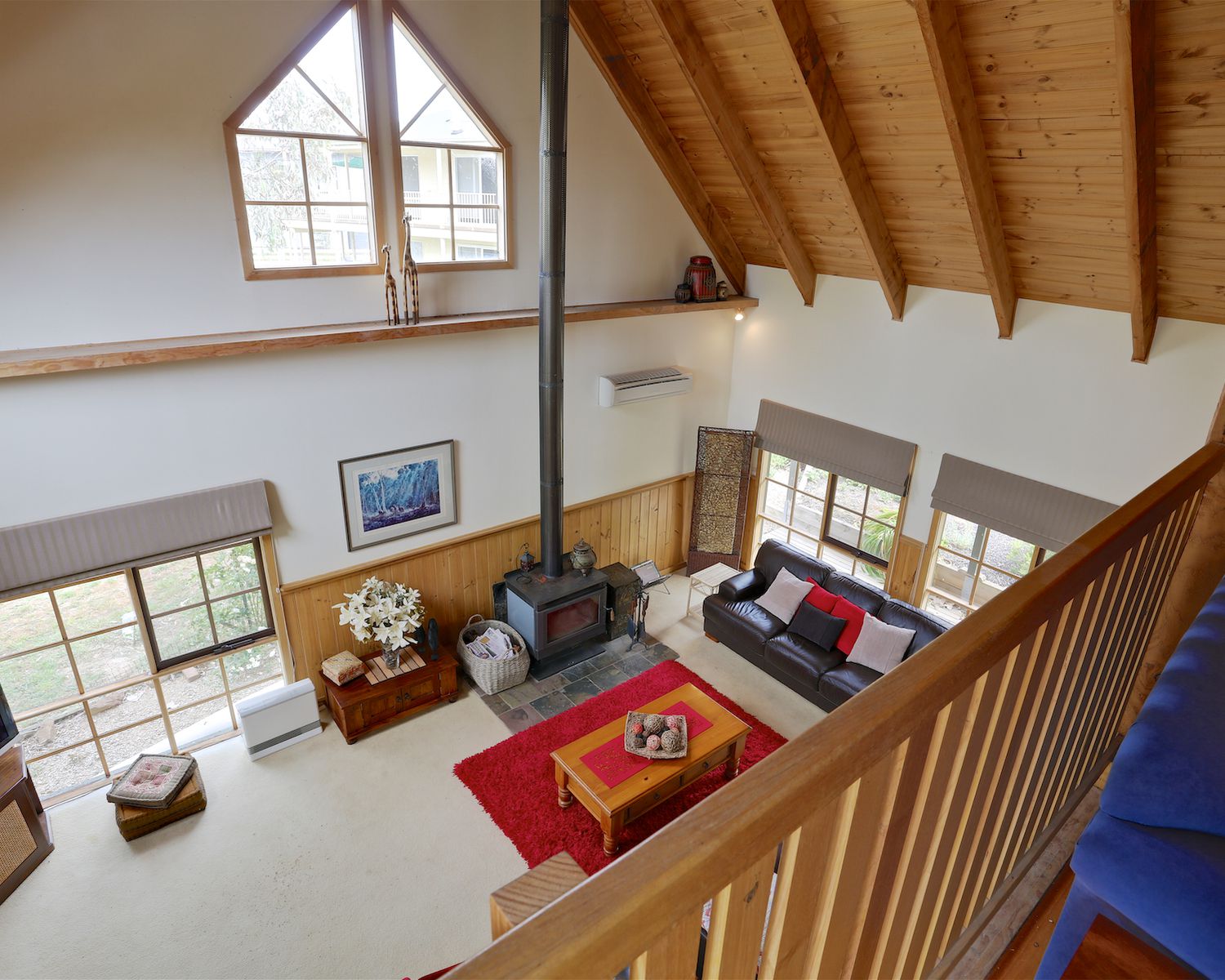 * Spacious living area with soaring cathedral ceilings, split system & wood fire