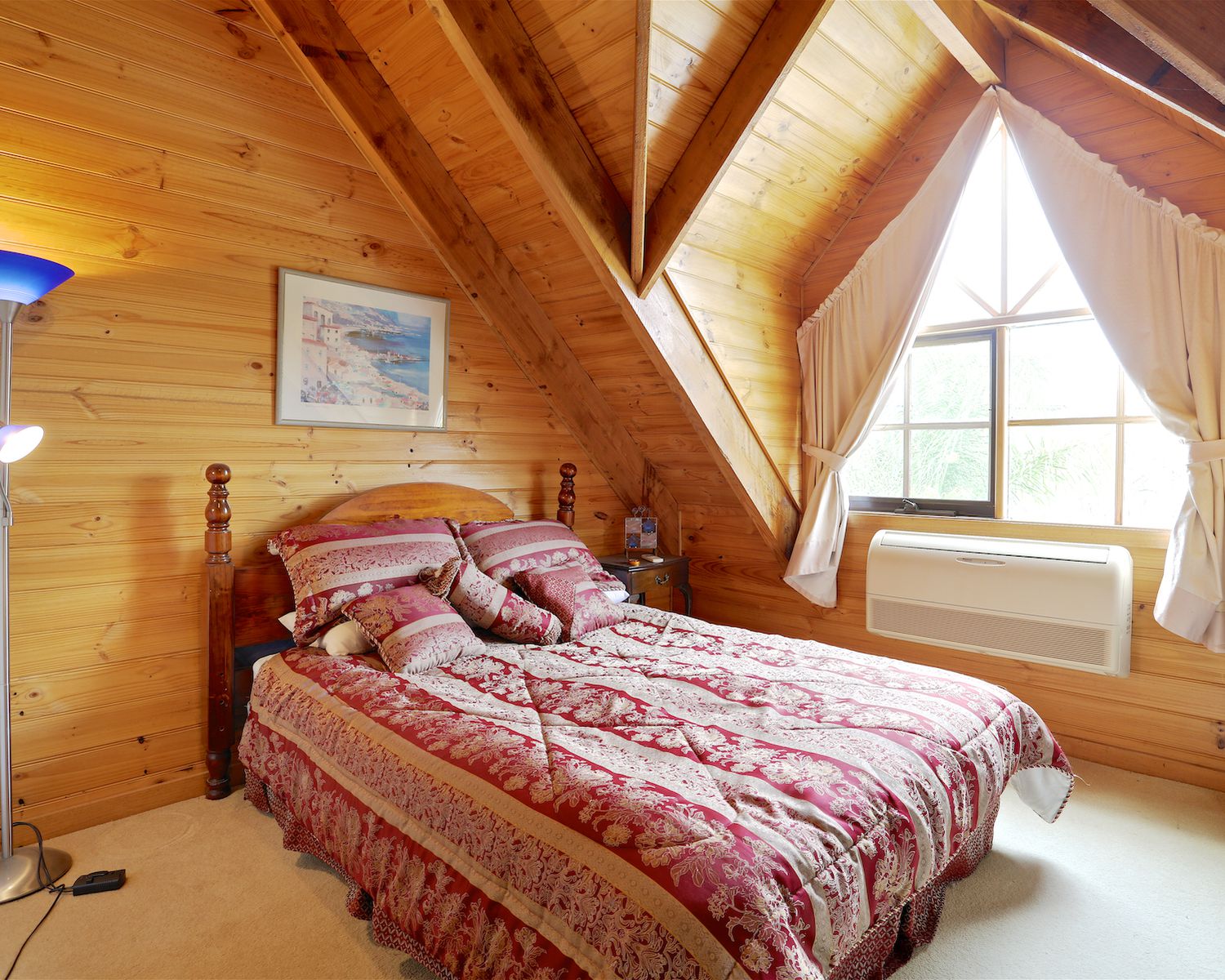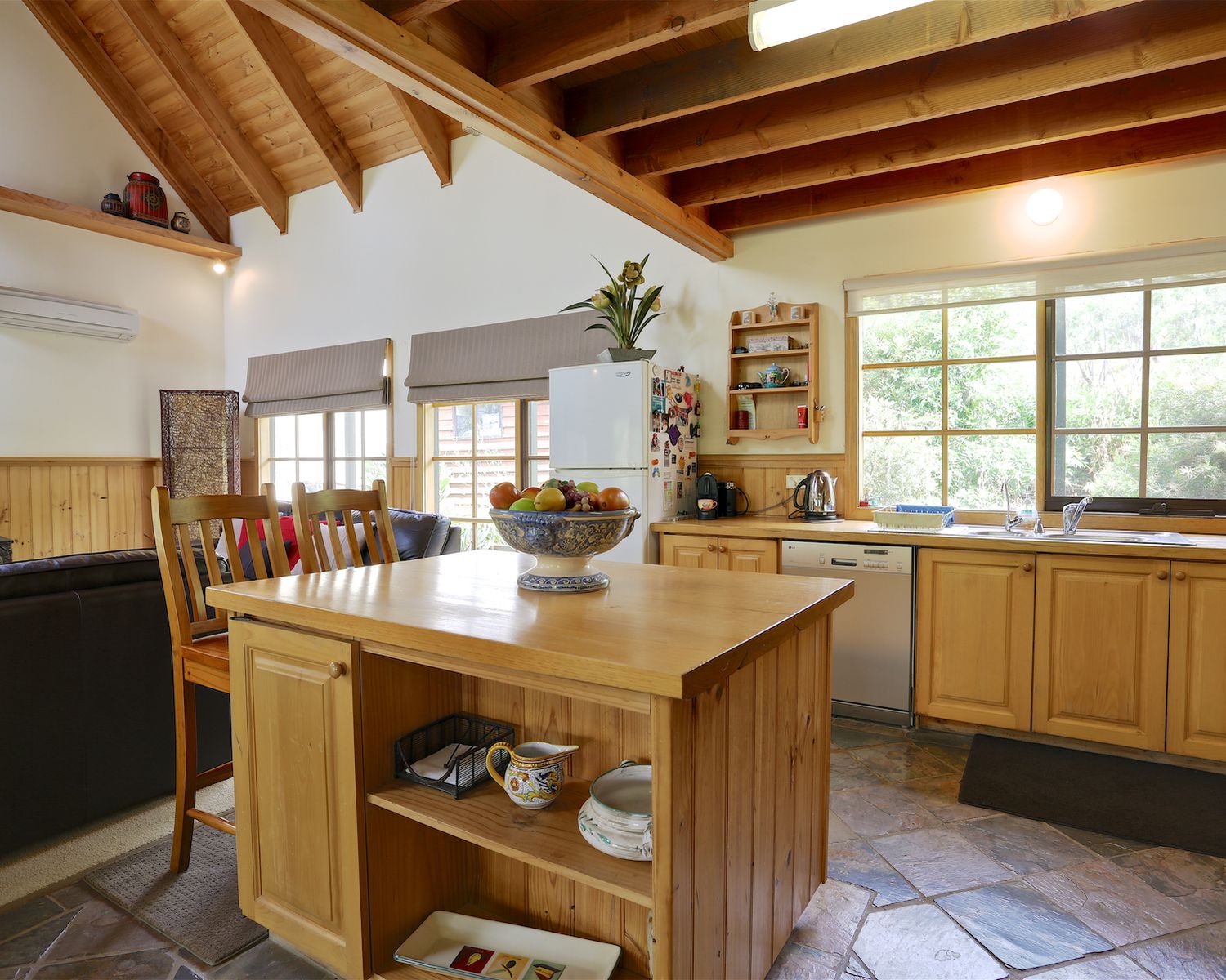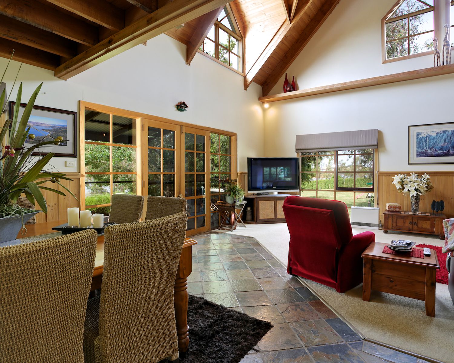 * Spacious living area with soaring cathedral ceilings, split system & wood fire
