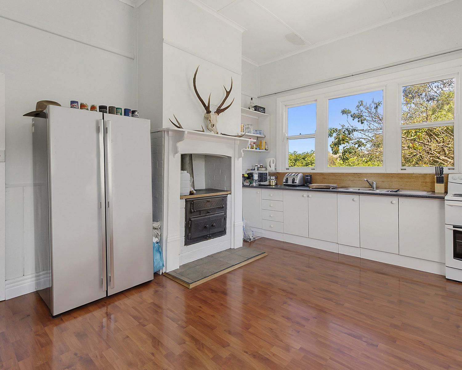 - Bright kitchen with slow combustion stove and an electric stove