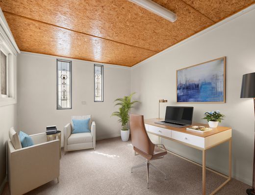 As you step inside, you'll be greeted by a warm and inviting kitchen/living area with cathedral ceilings, creating a sense of space and light that instantly feels like home. This central hub of the house is the perfect place for both family gatherings and quiet evenings. The large windows flood the space with natural light and offer a seamless connection to the north-facing courtyard.