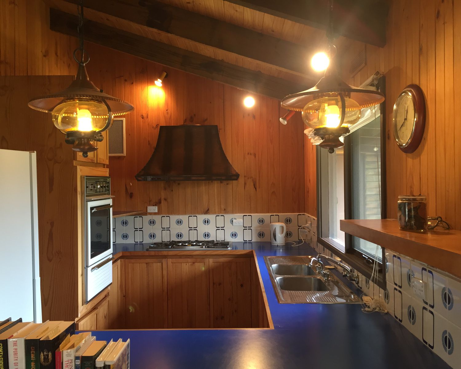 Kitchen with gas cooktop and servery to dining.