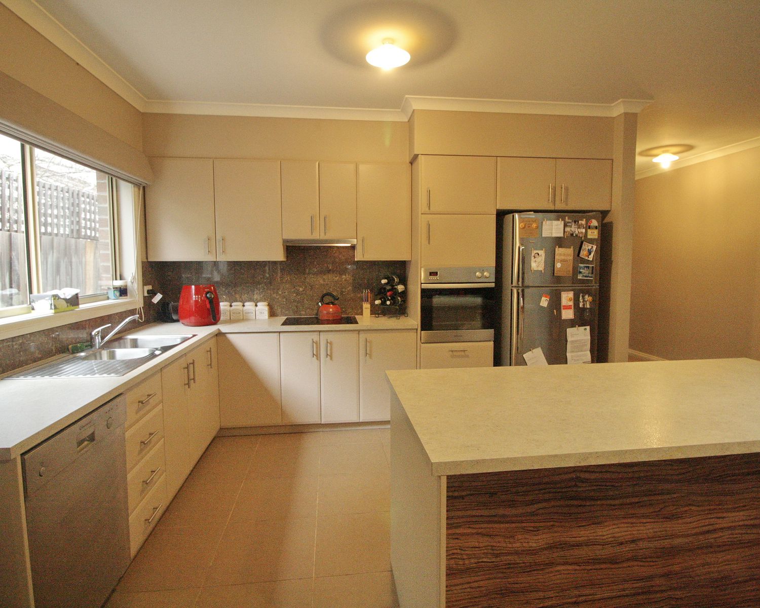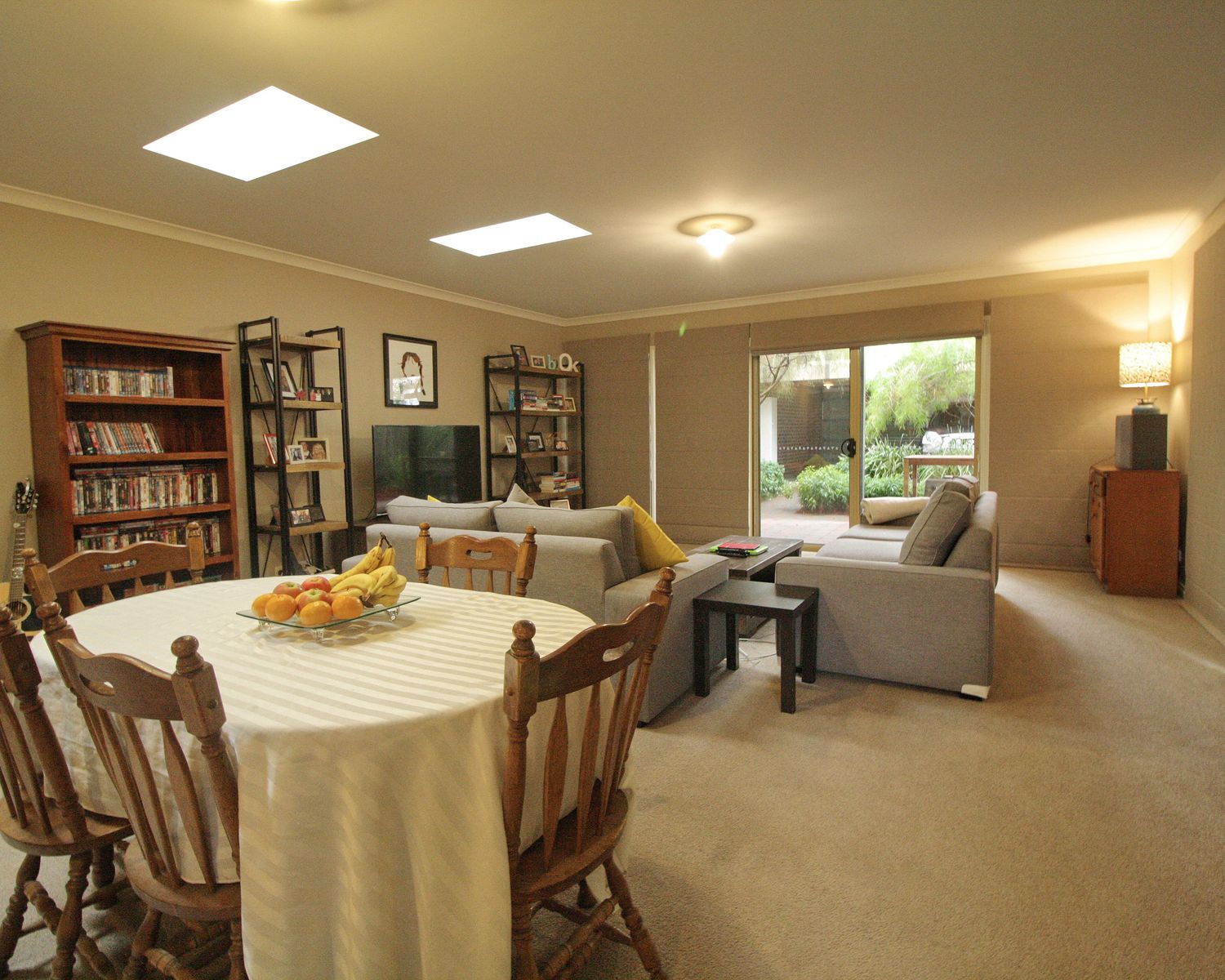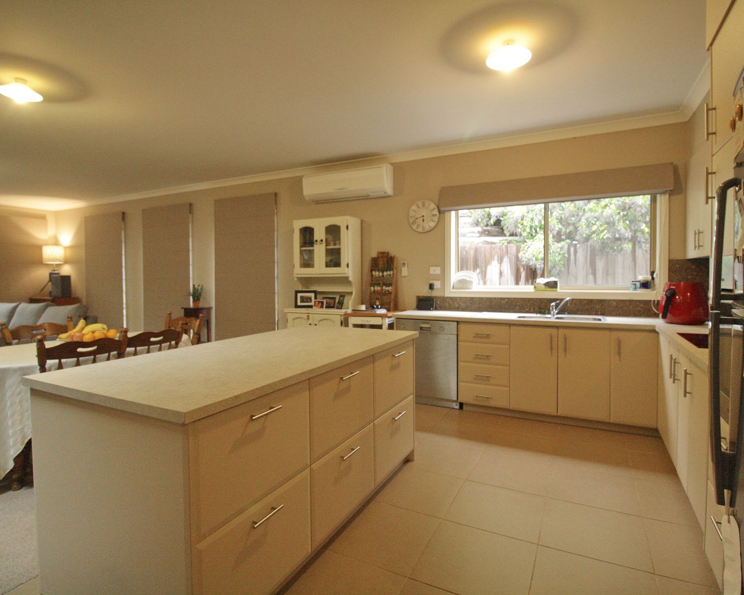 Open plan kitchen and lounge room with great light from large windows and three skylights.