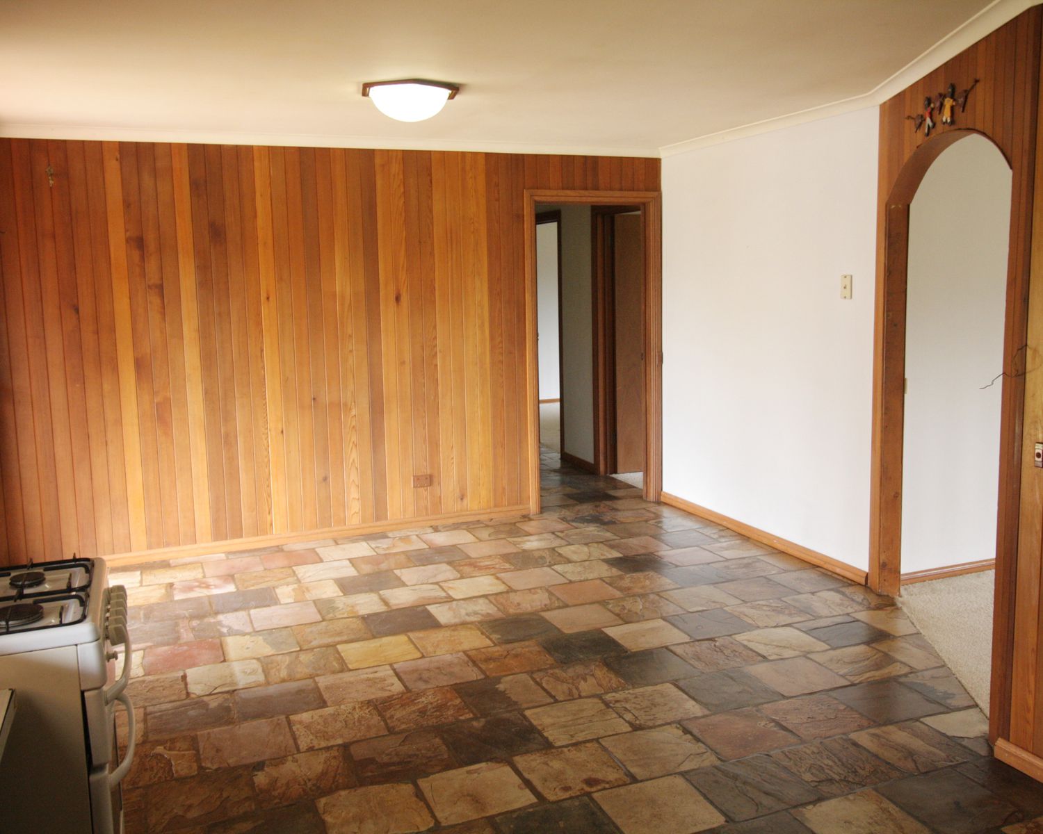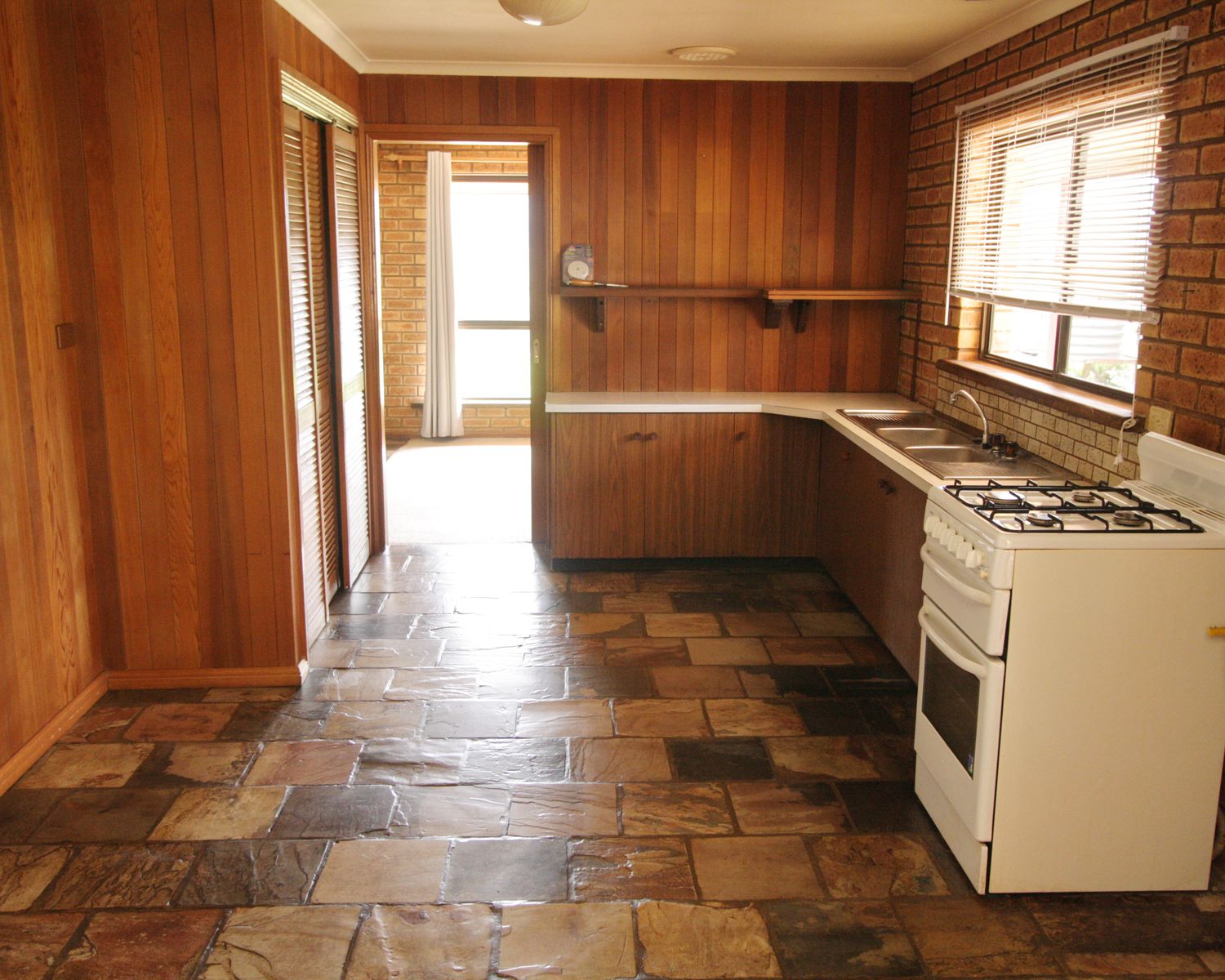 Kitchen with gas cooking, large pantry and dining area.