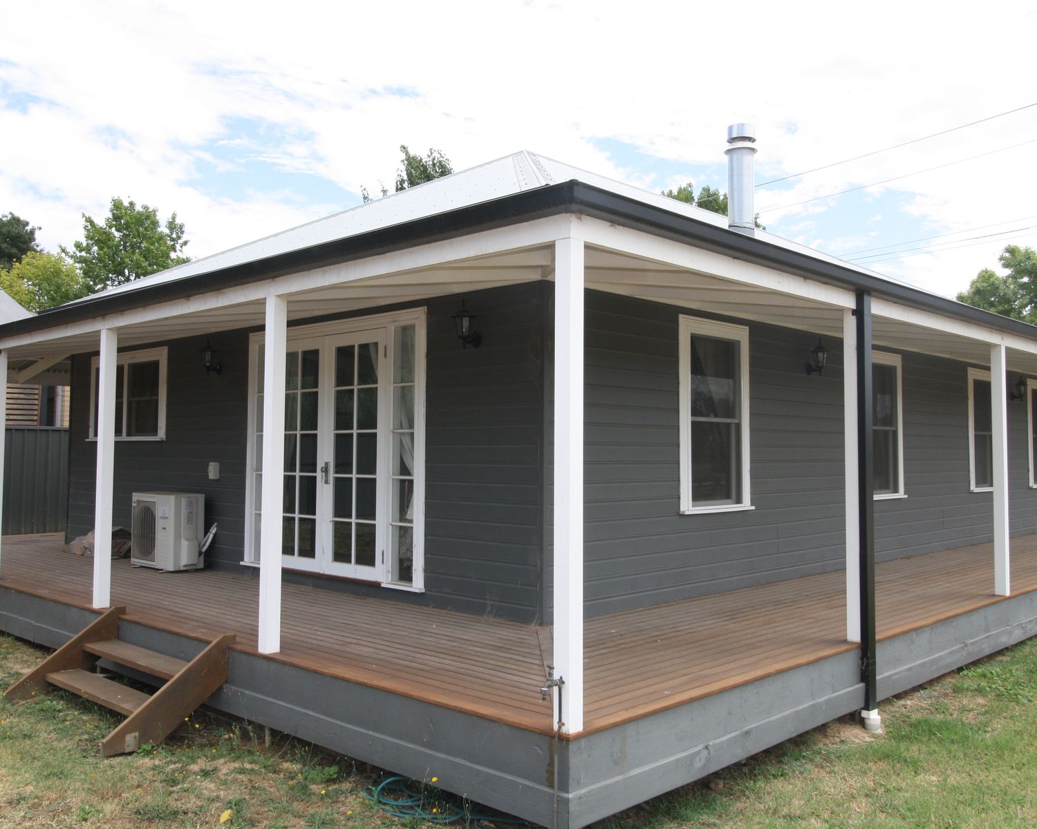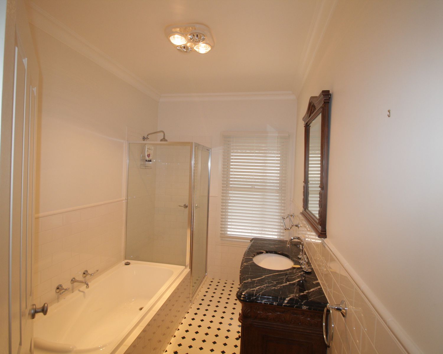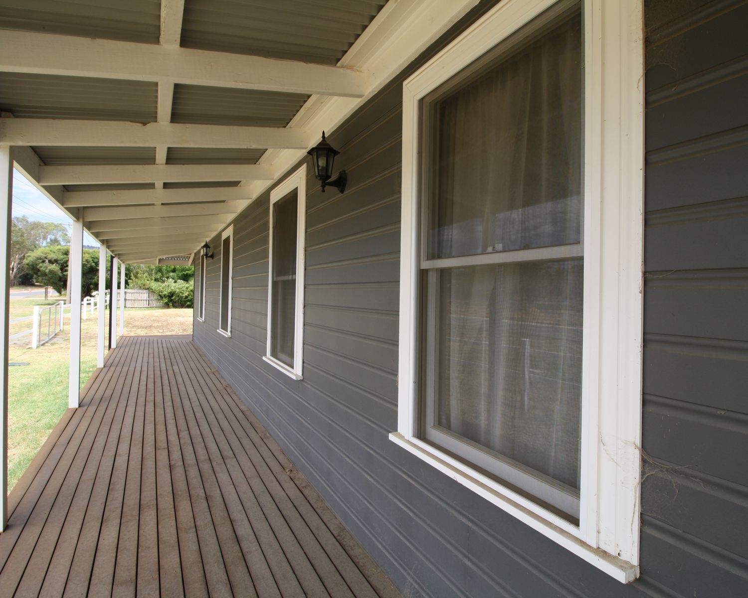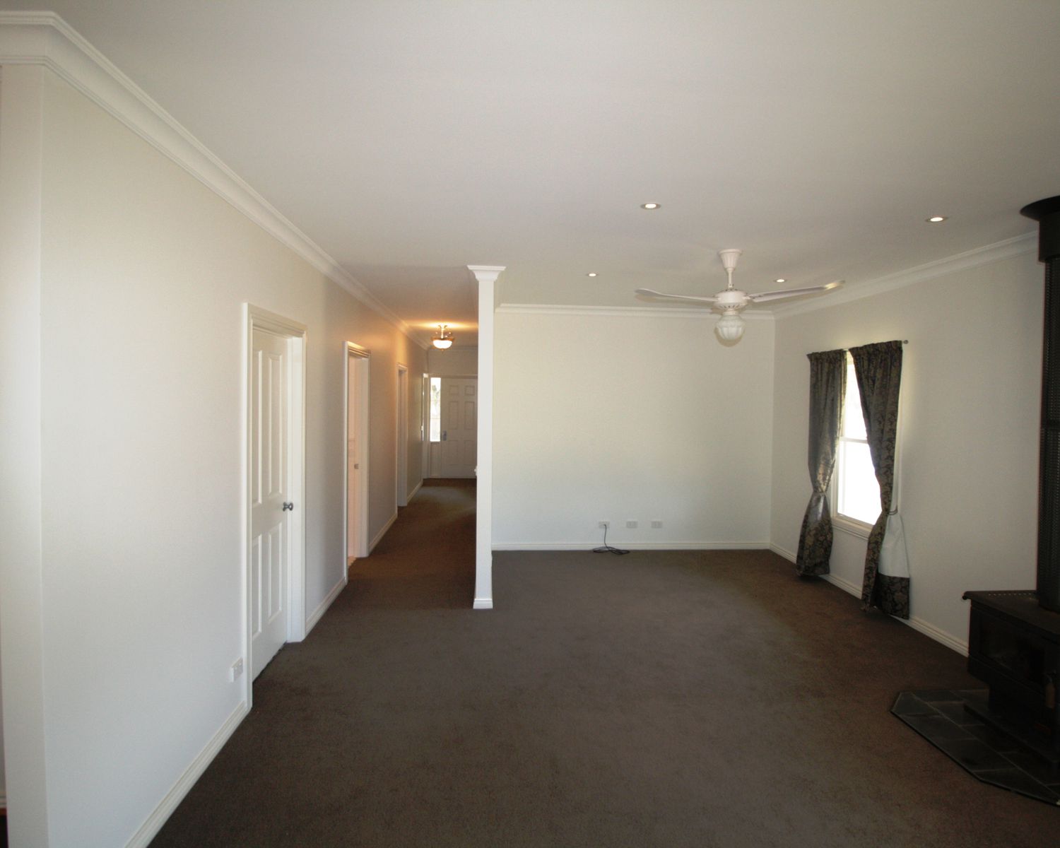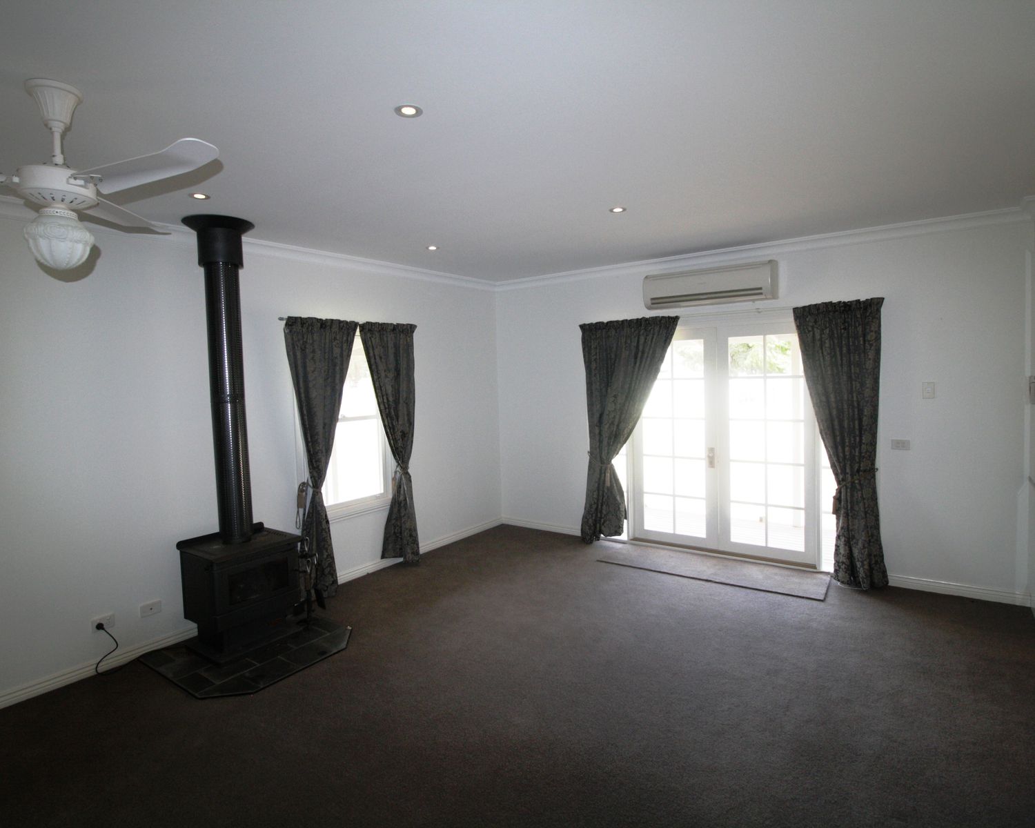 Lounge with split system heating and cooling, wood fire heater plus ceiling fan.