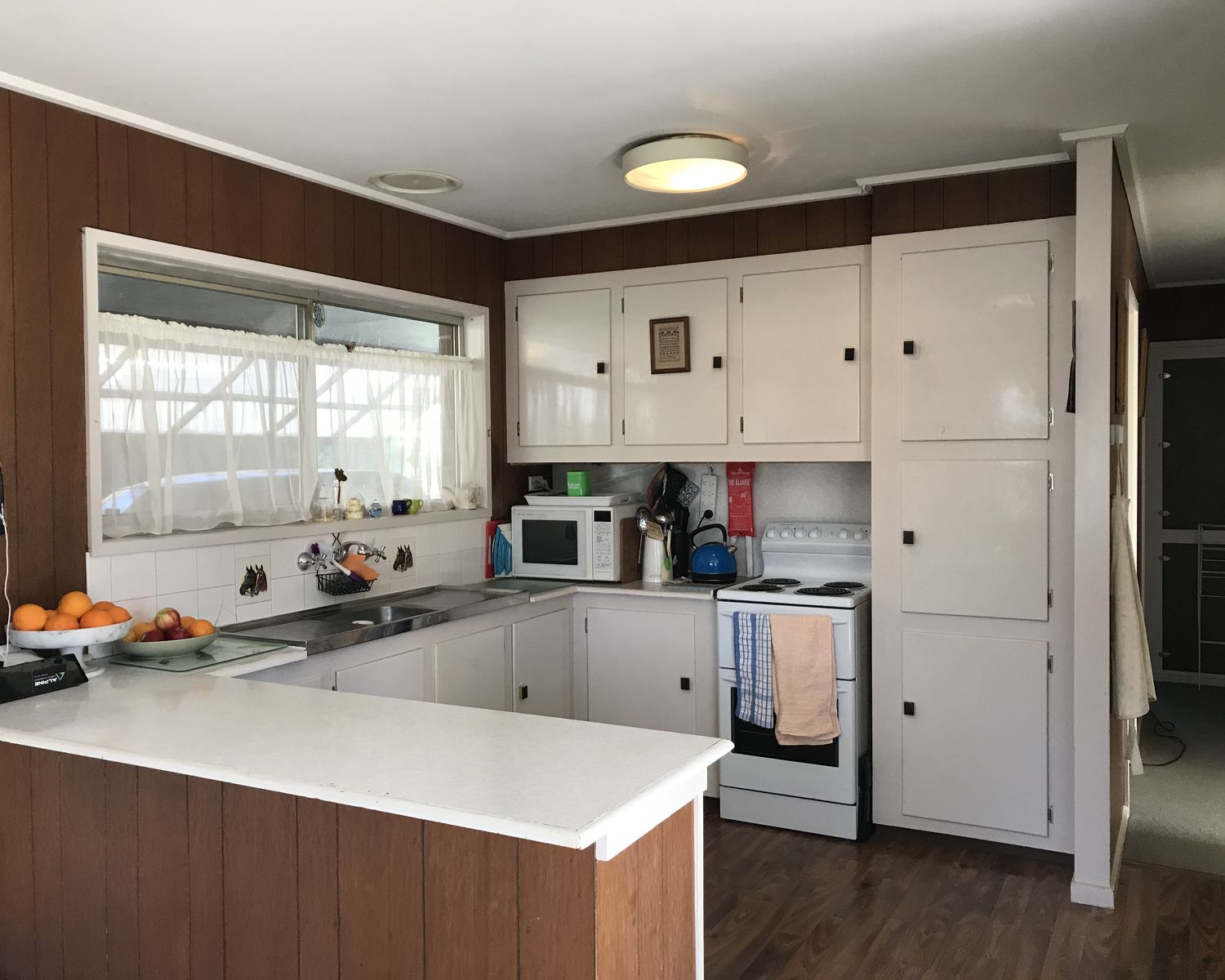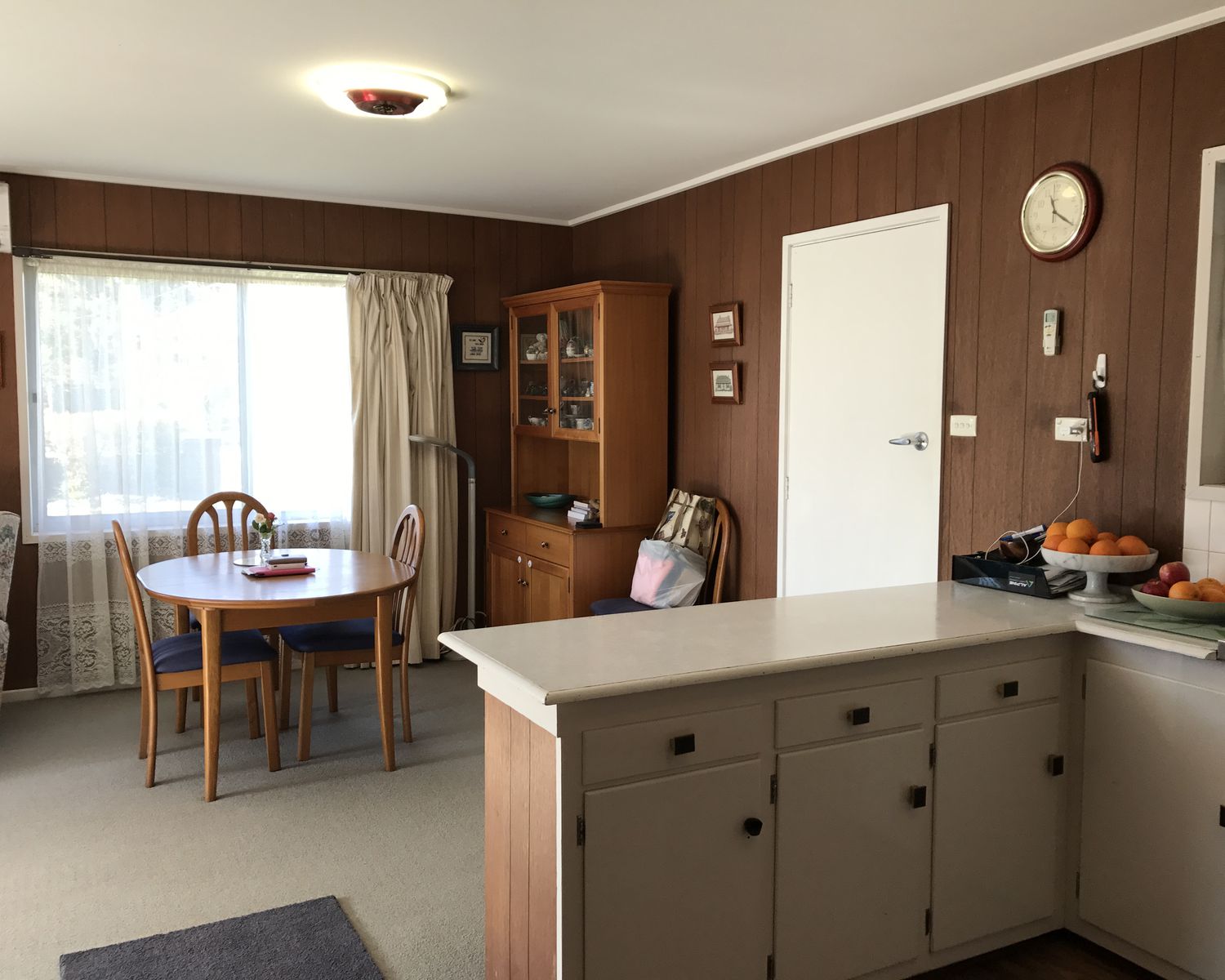 Open plan kitchen, dining and lounge room with sliding glass door out to side patio.