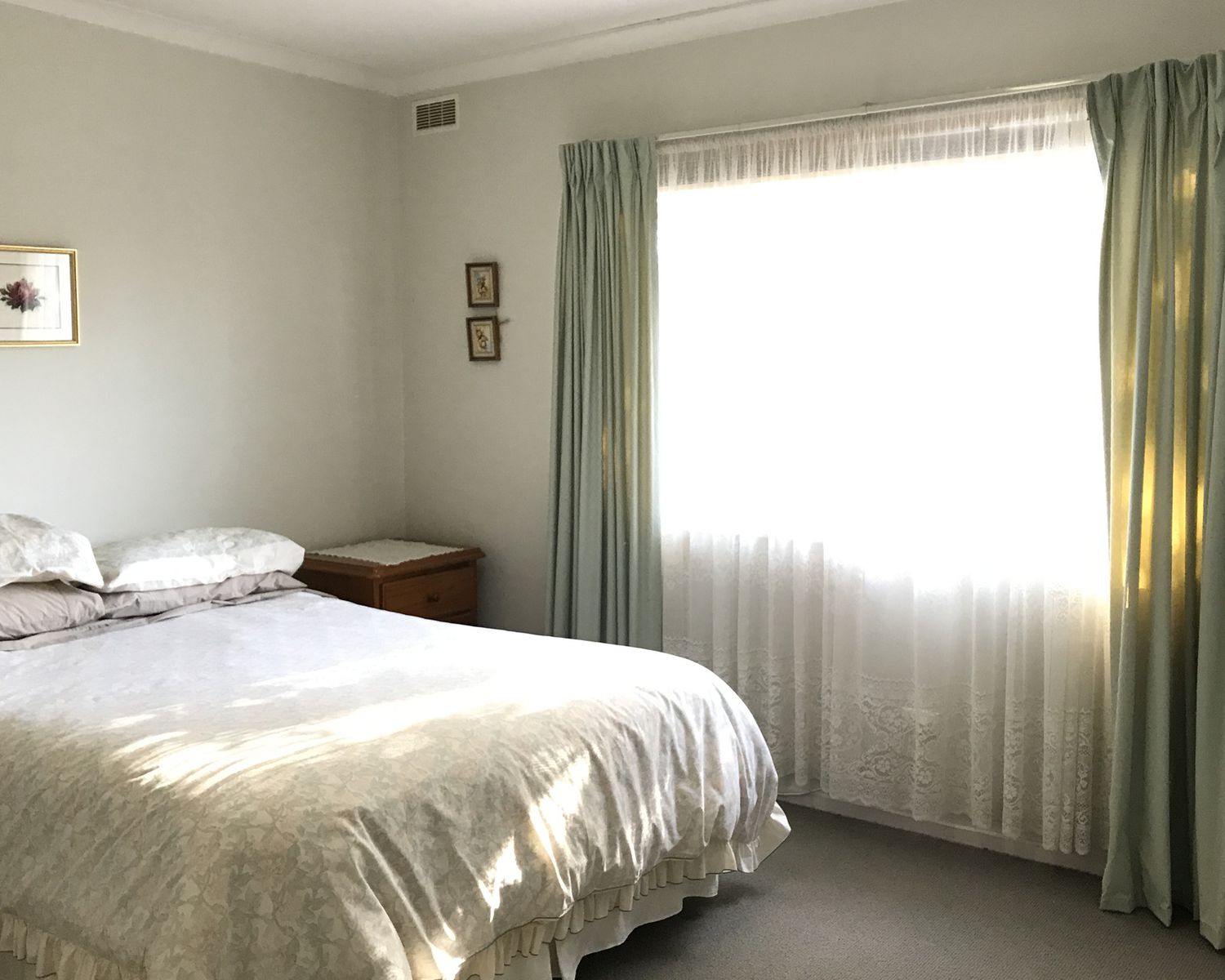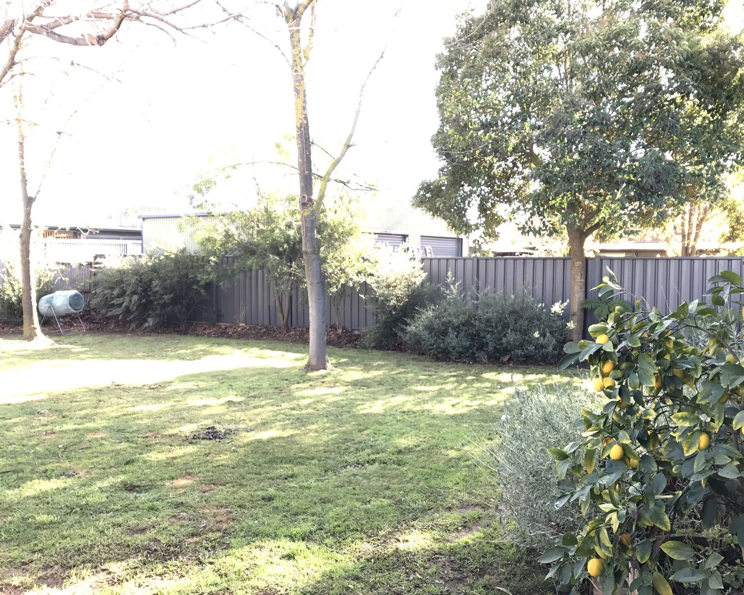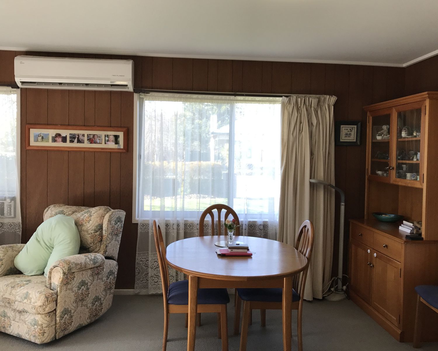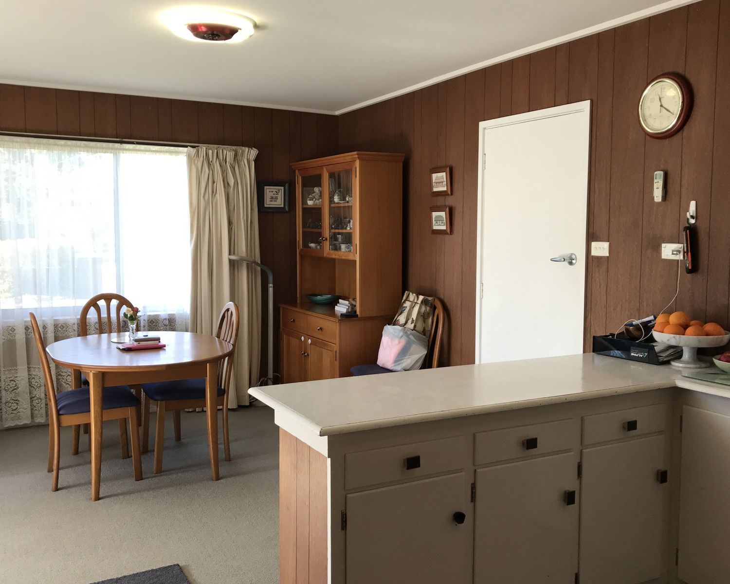 Open plan kitchen, dining and lounge room with sliding glass door out to side patio.