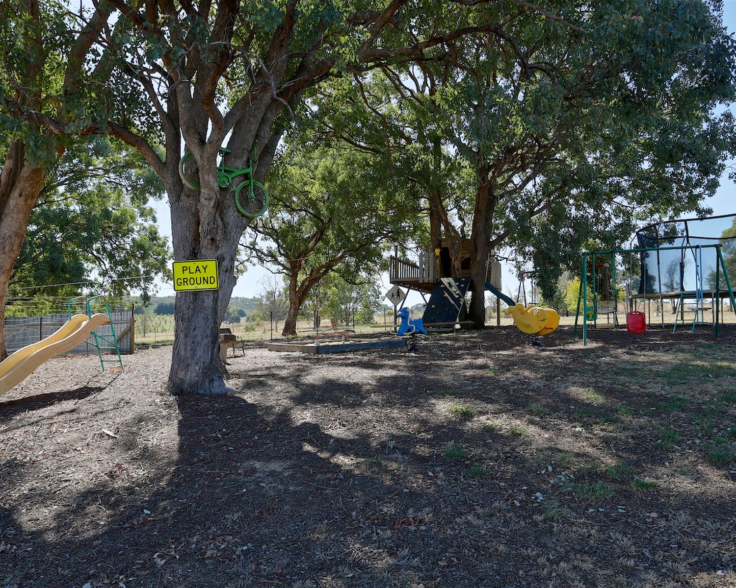 * Outdoor toilet, Commercial children's playground and adjacent powered caravan site area (the whole family can stay!)