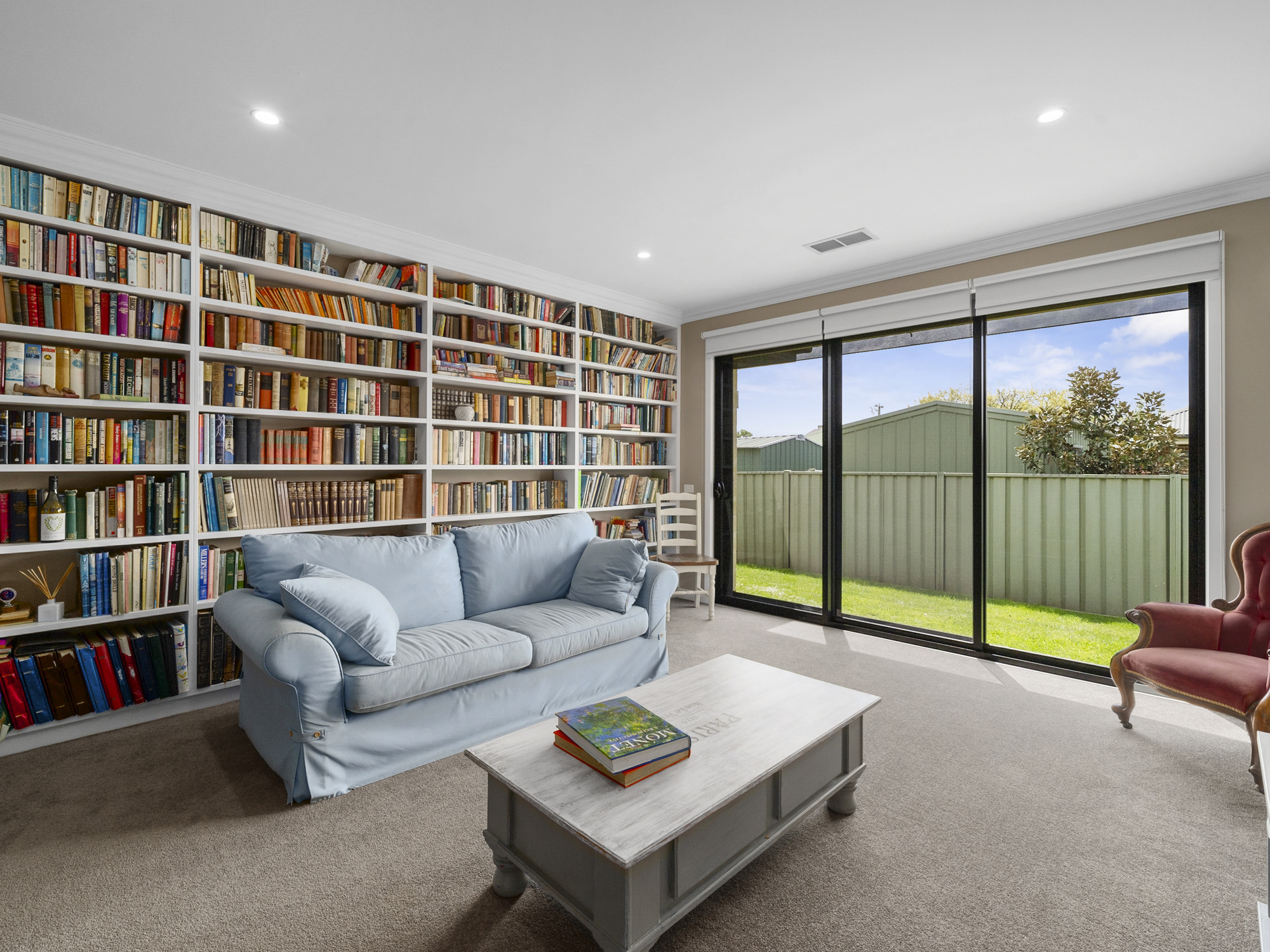 A formal living area with floor-to-ceiling bookshelves and a built-in bar, perfect for entertaining or relaxing.