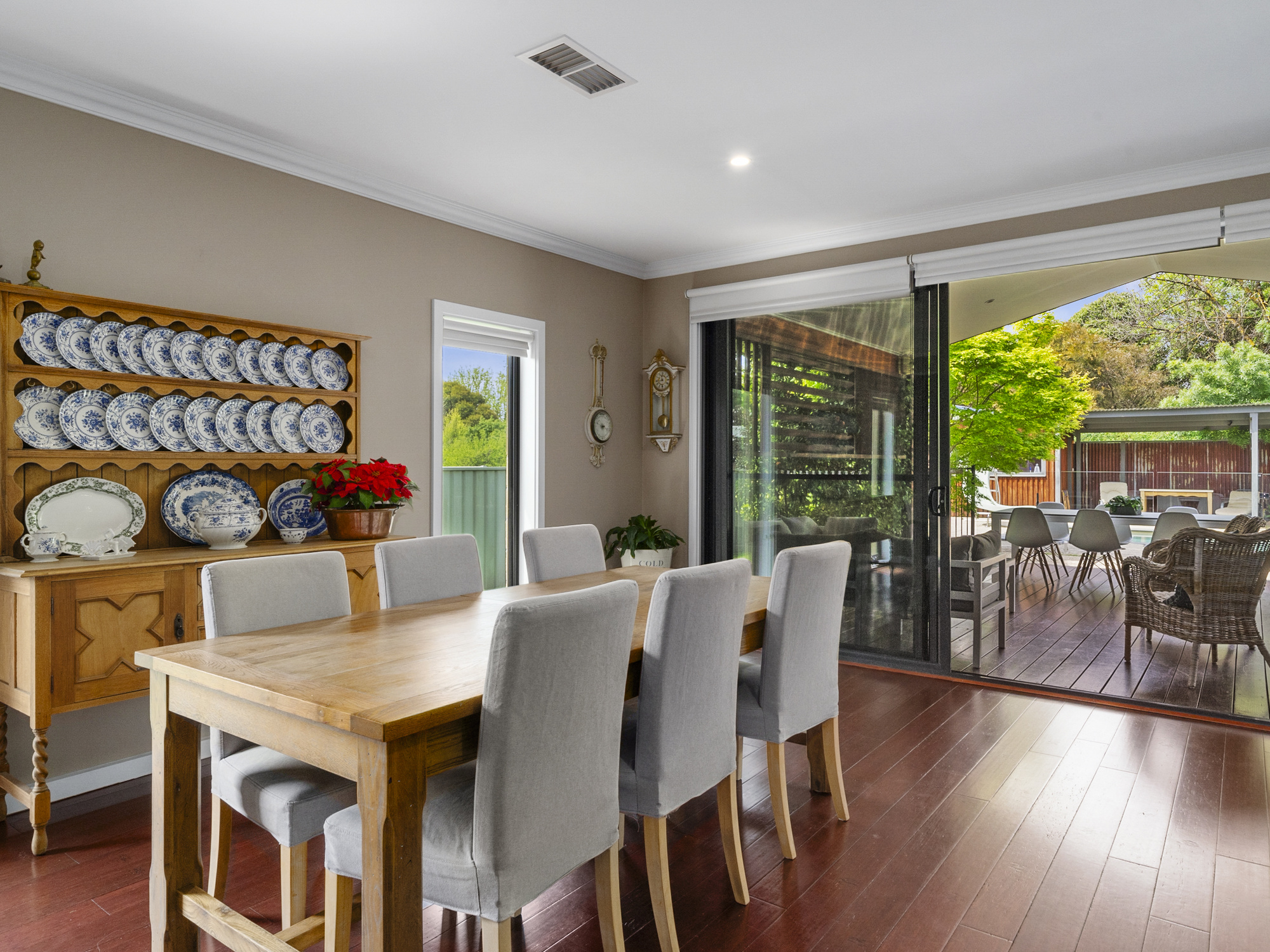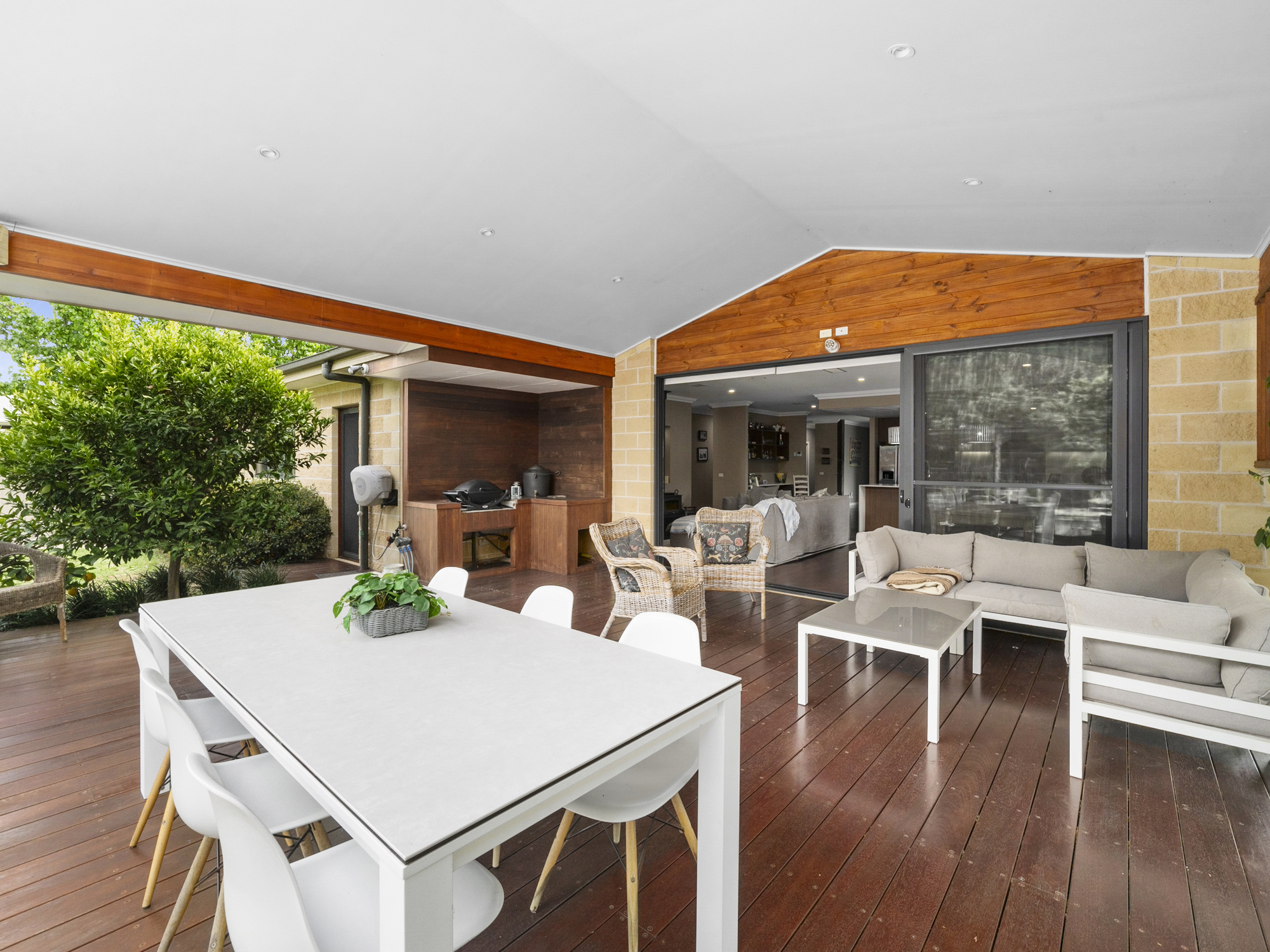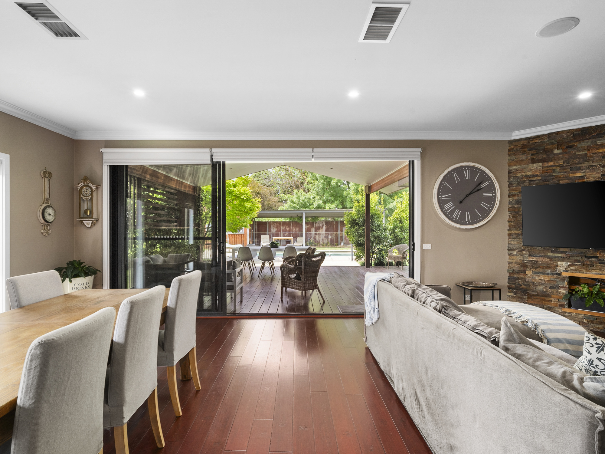 An open plan living, kitchen, and dining space with seamless access to the backyard entertainment area.