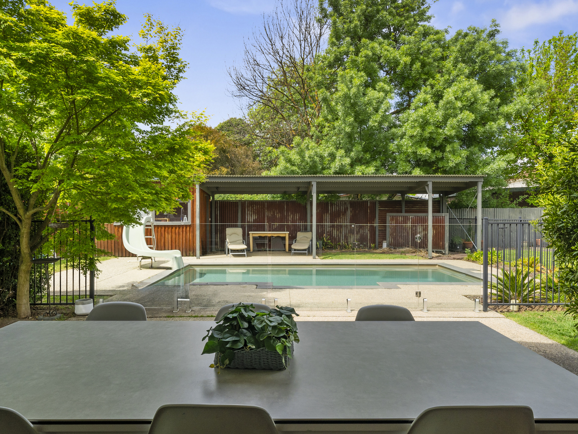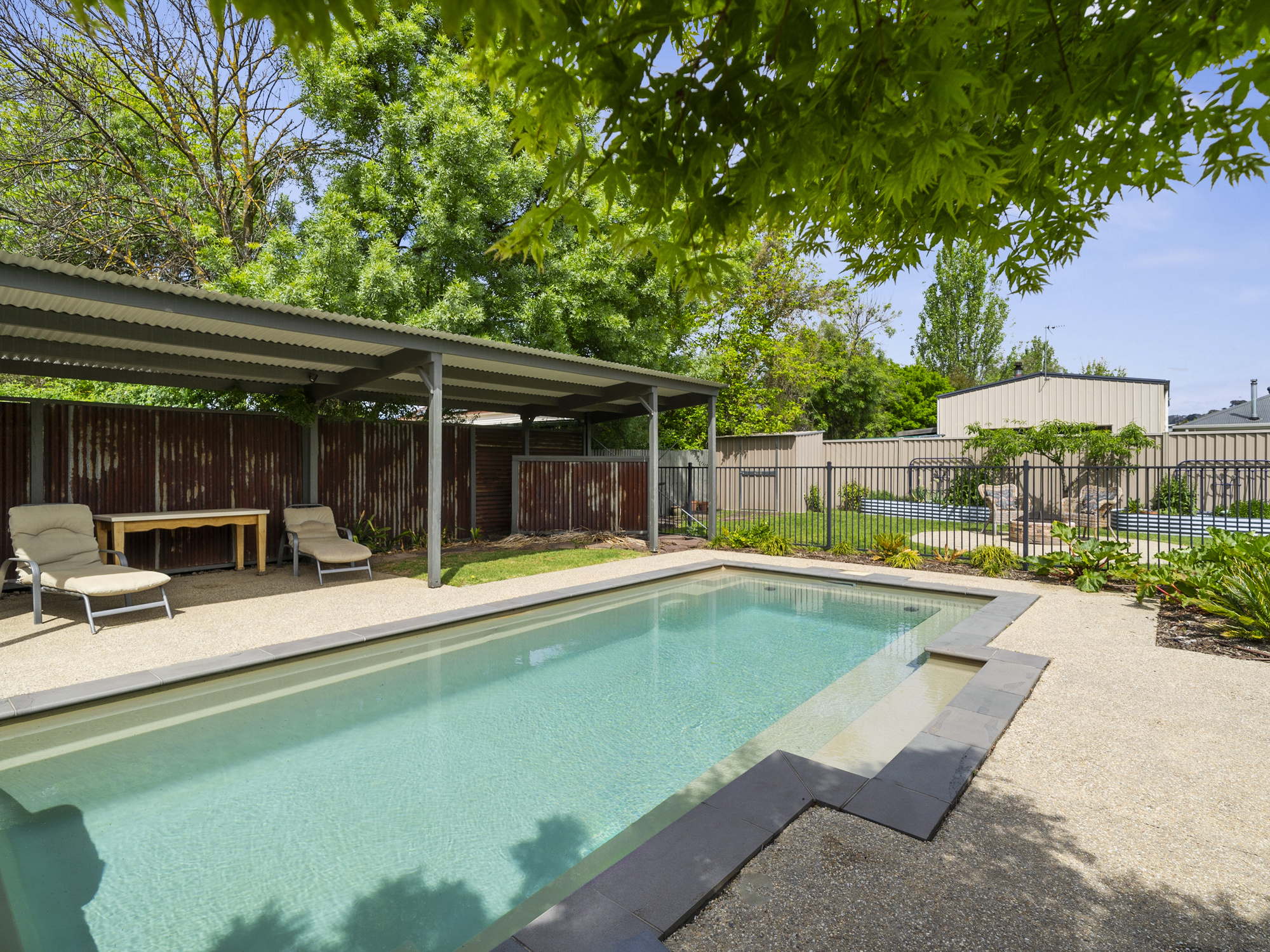A low-maintenance backyard with an inground solar-heated saltwater pool and a covered entertainment area.