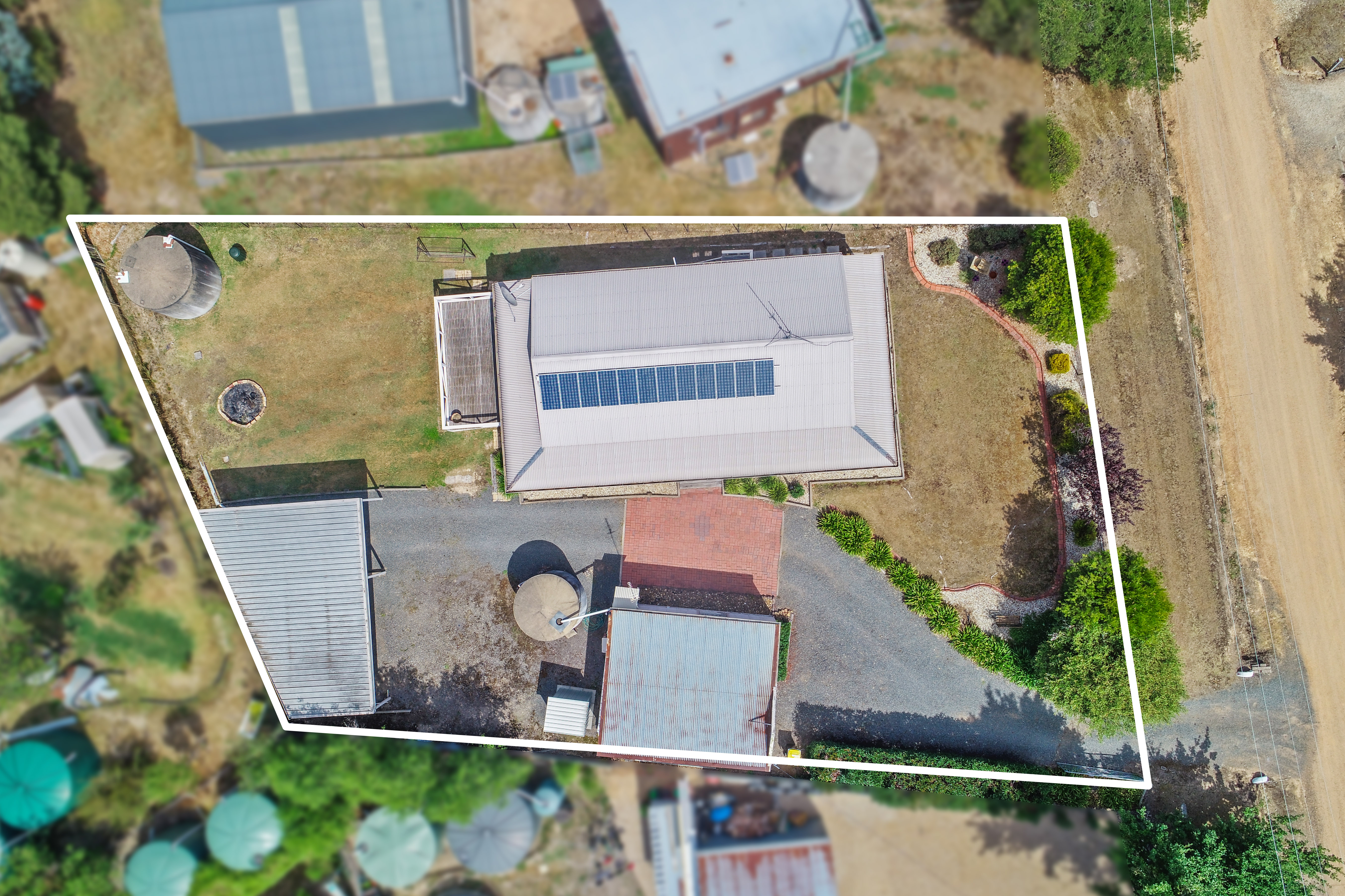 Pay next to nothing for your power bills with the 12 panel solar system and two concrete water storage tanks provide enough water for the home and garden.