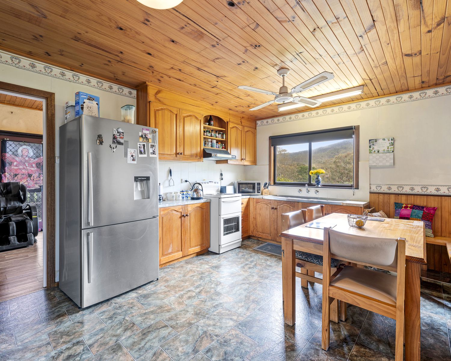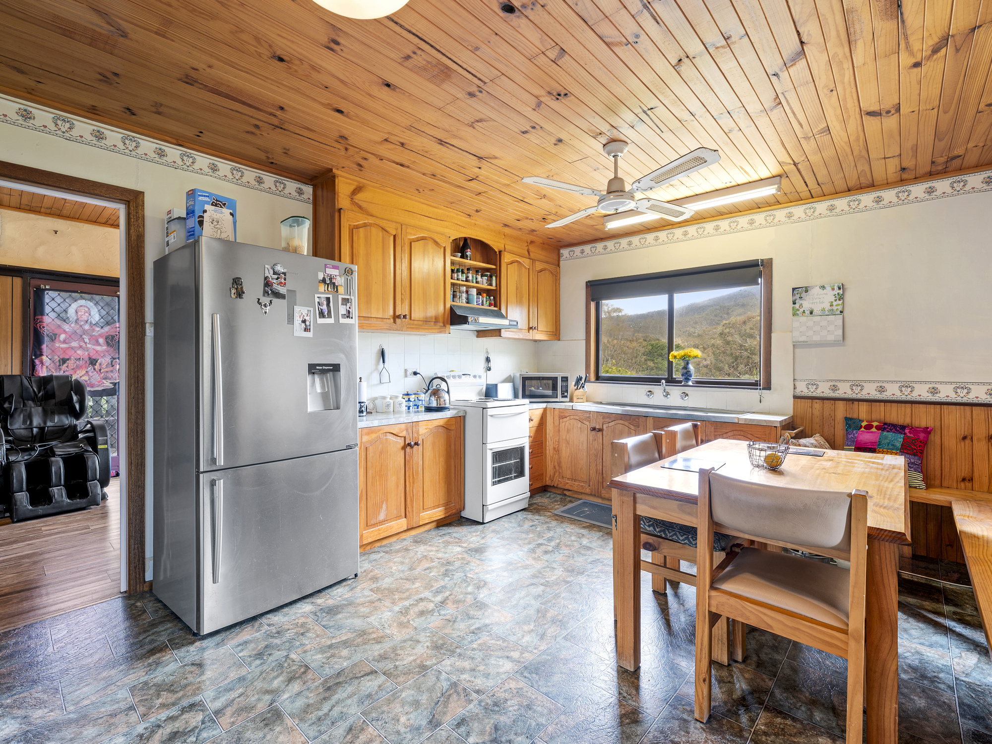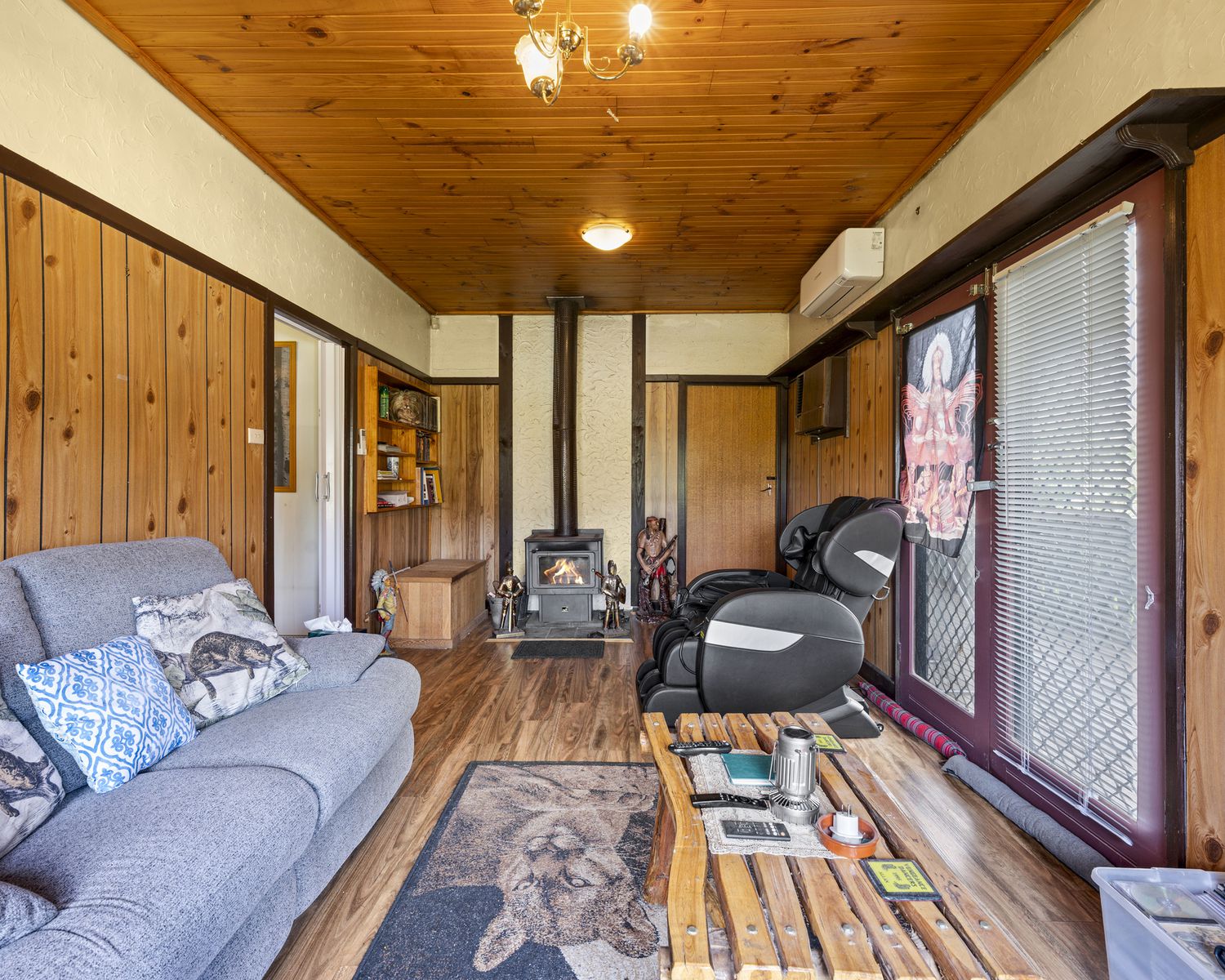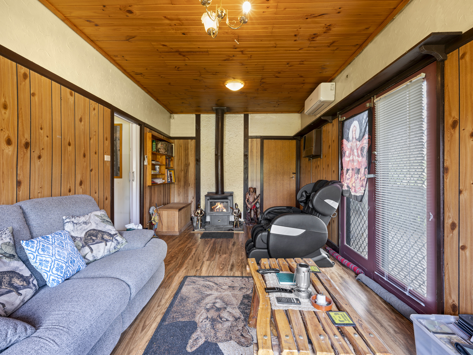 Inside, the home offers a combined kitchen and dining area, a separate lounge, a cosy wood fire for winter, and air conditioning for summer comfort. Surrounded by mature trees, the cottage gardens create a tranquil retreat.