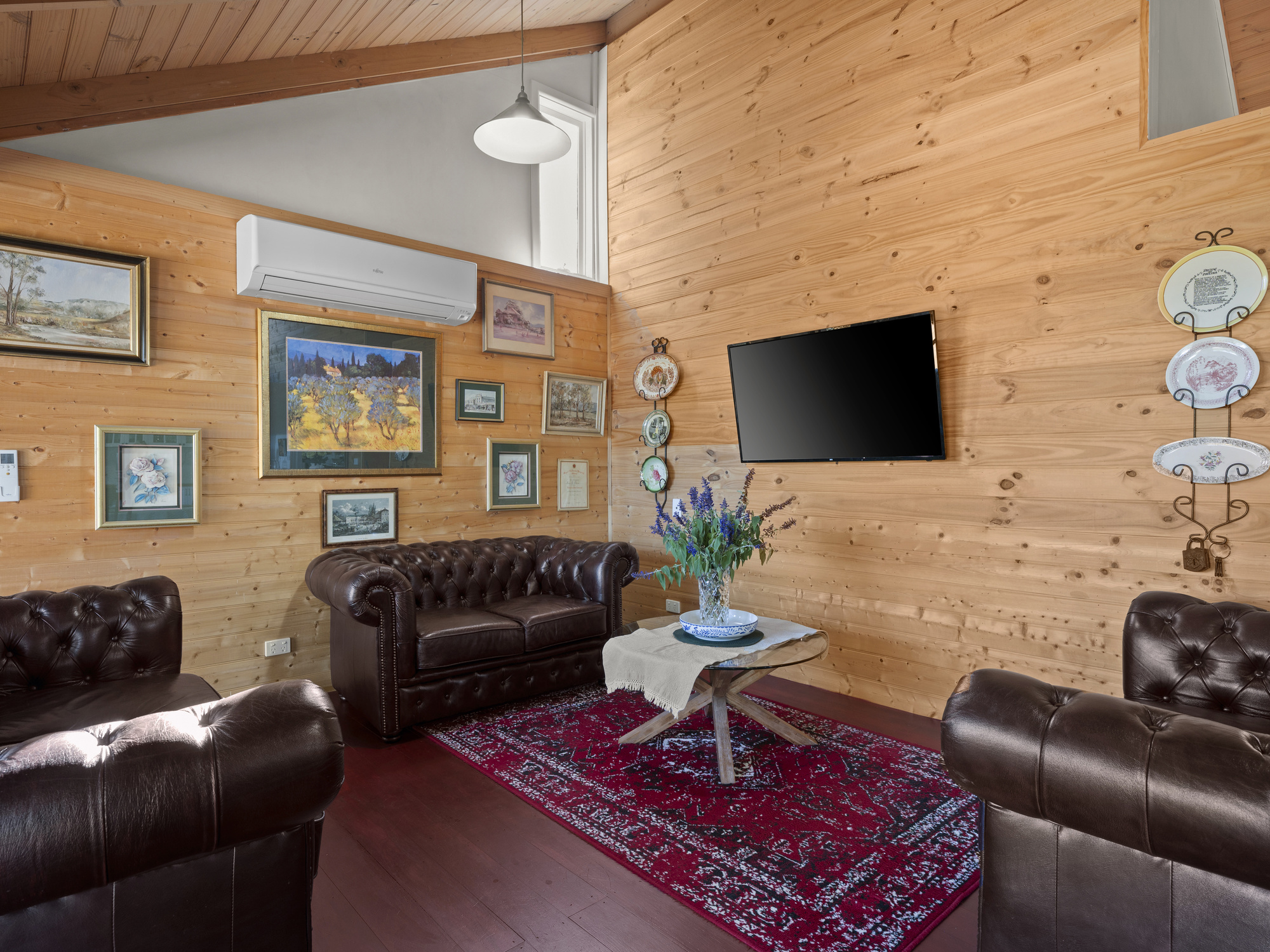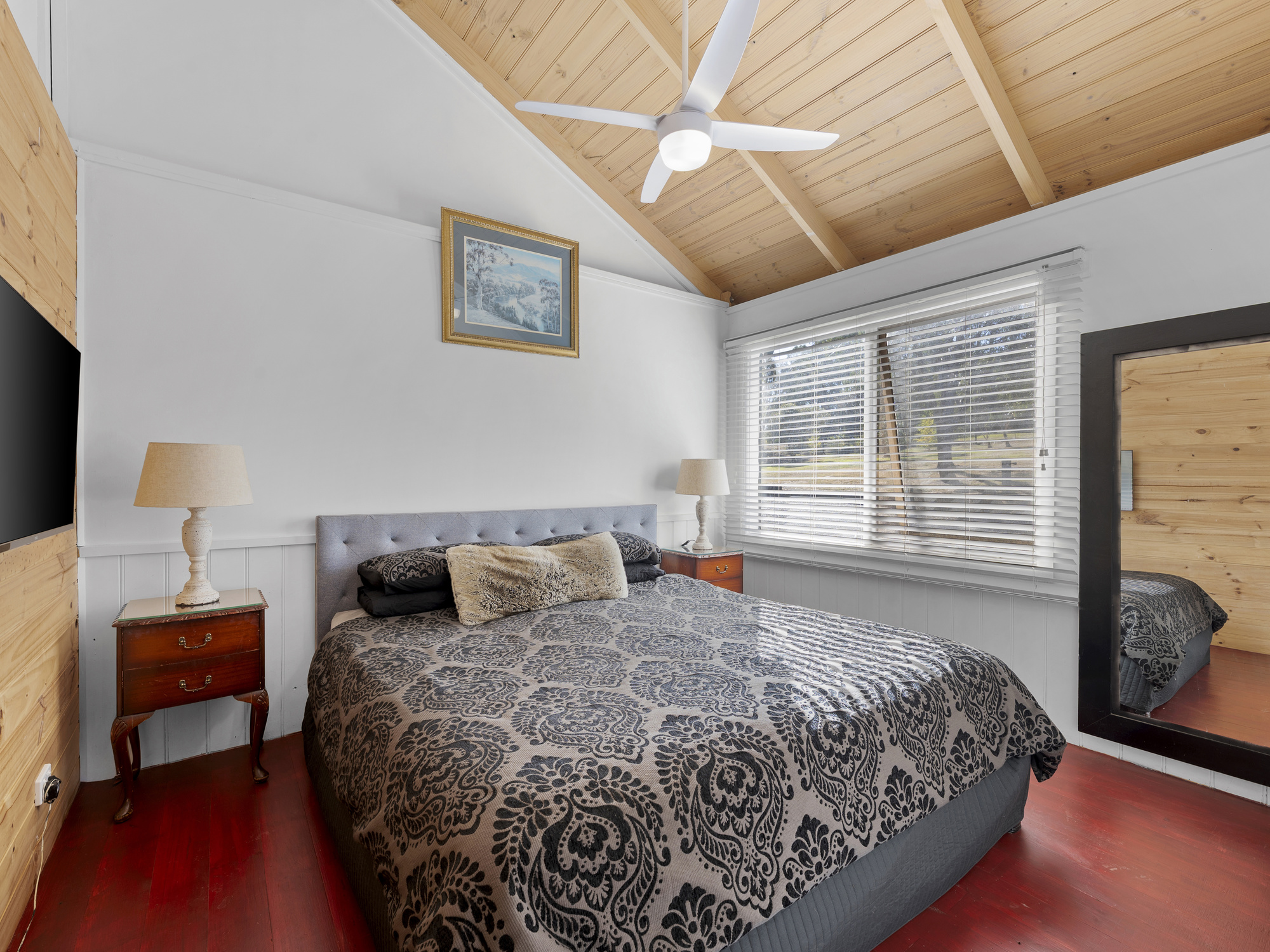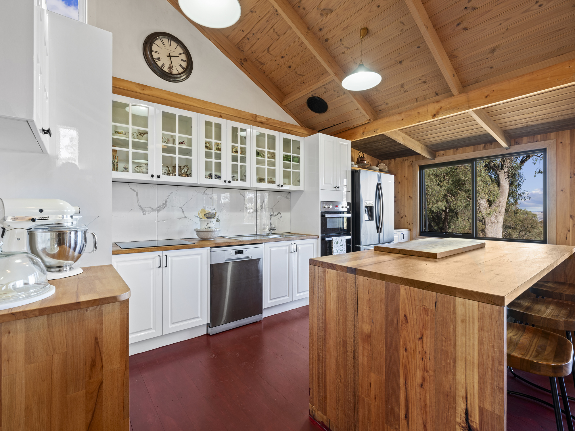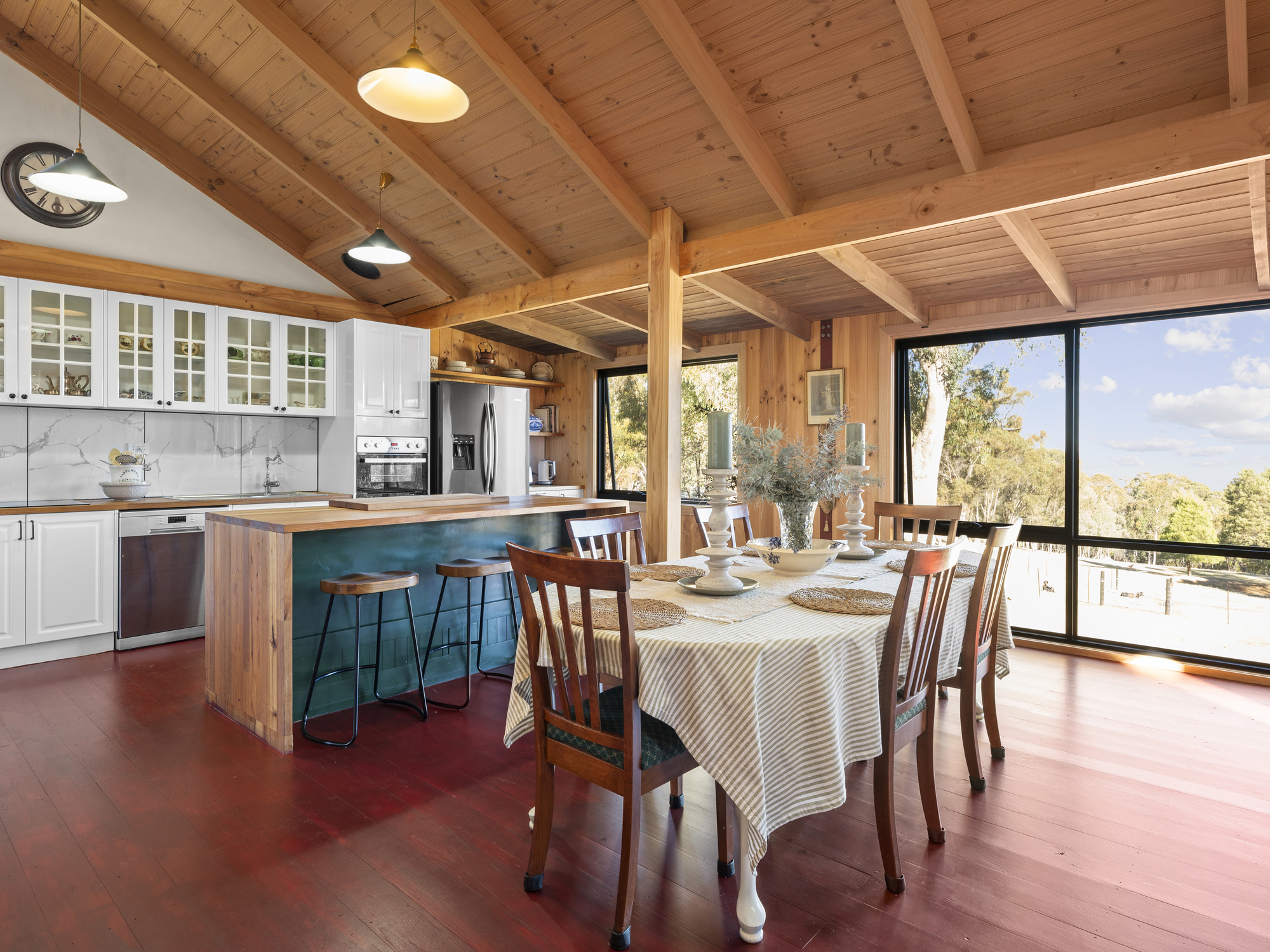Step inside to soaring cathedral ceilings, warm timber finishes, and sunlit open-plan living. The stylish kitchen features timber benchtops, quality appliances, and a corner pantry, flowing seamlessly to a spacious dining and lounge area with split system heating/cooling.