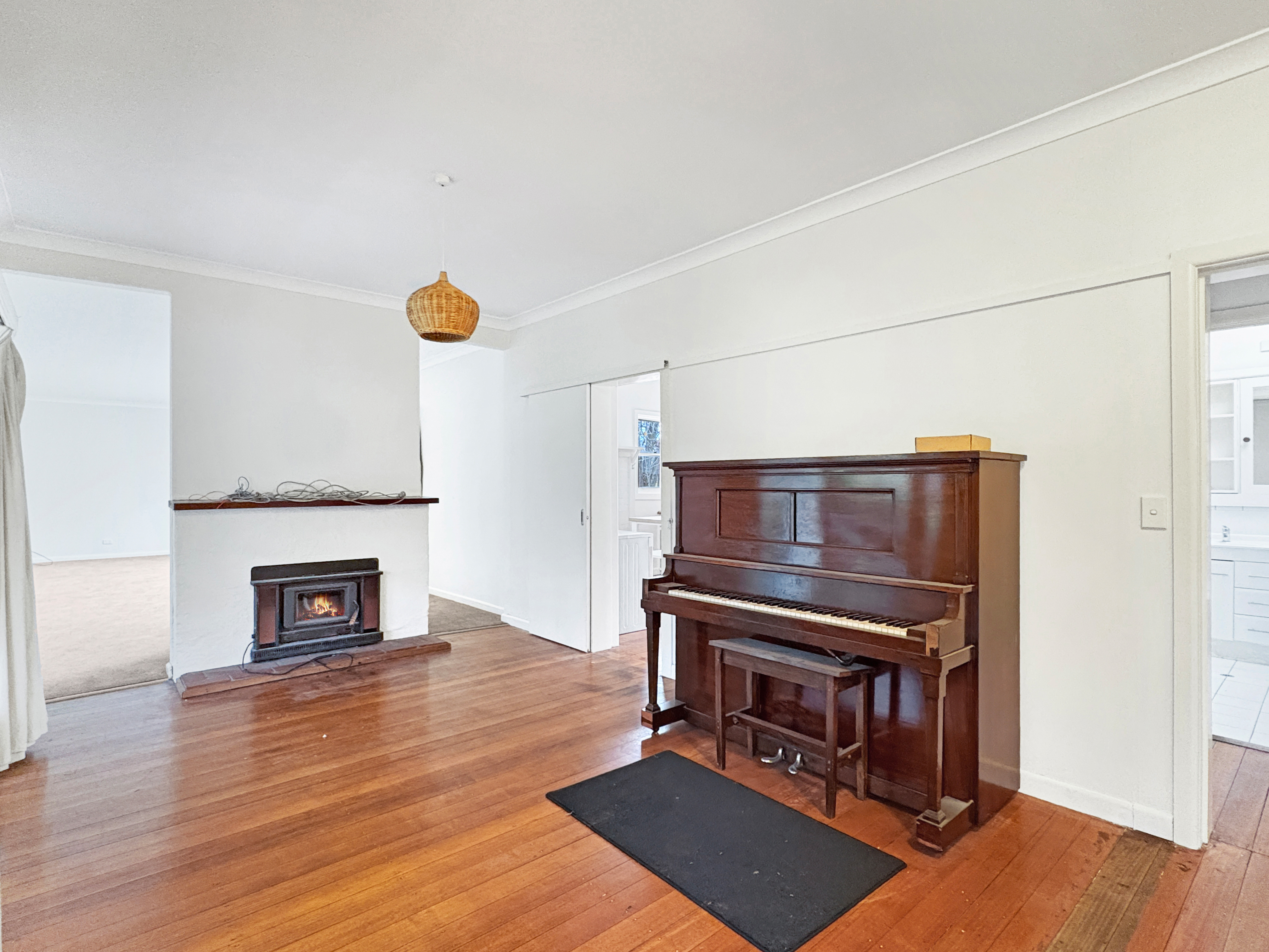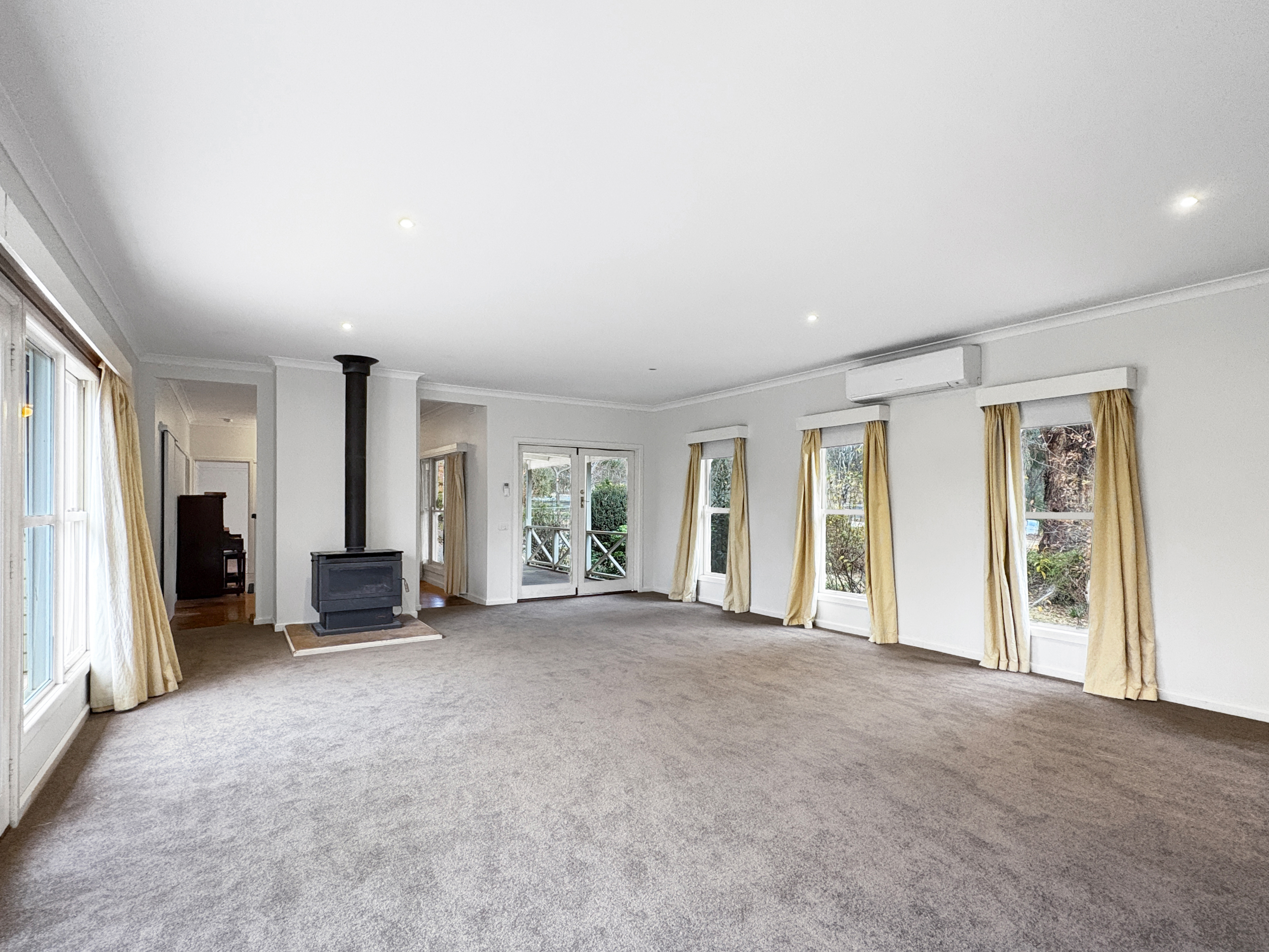 Expansive lounge with large Coonara wood fireplace and split system heating/cooling, perfect for year-round comfort