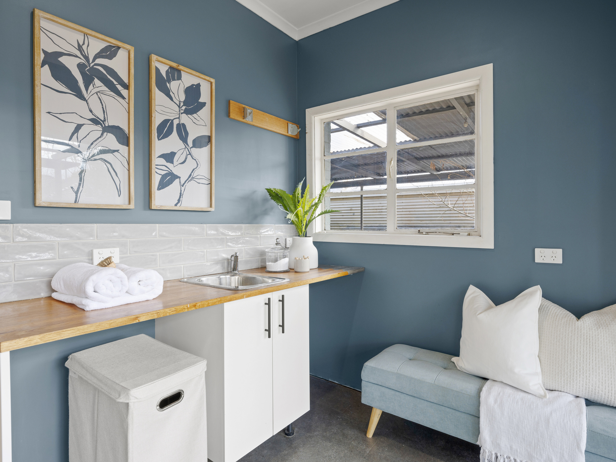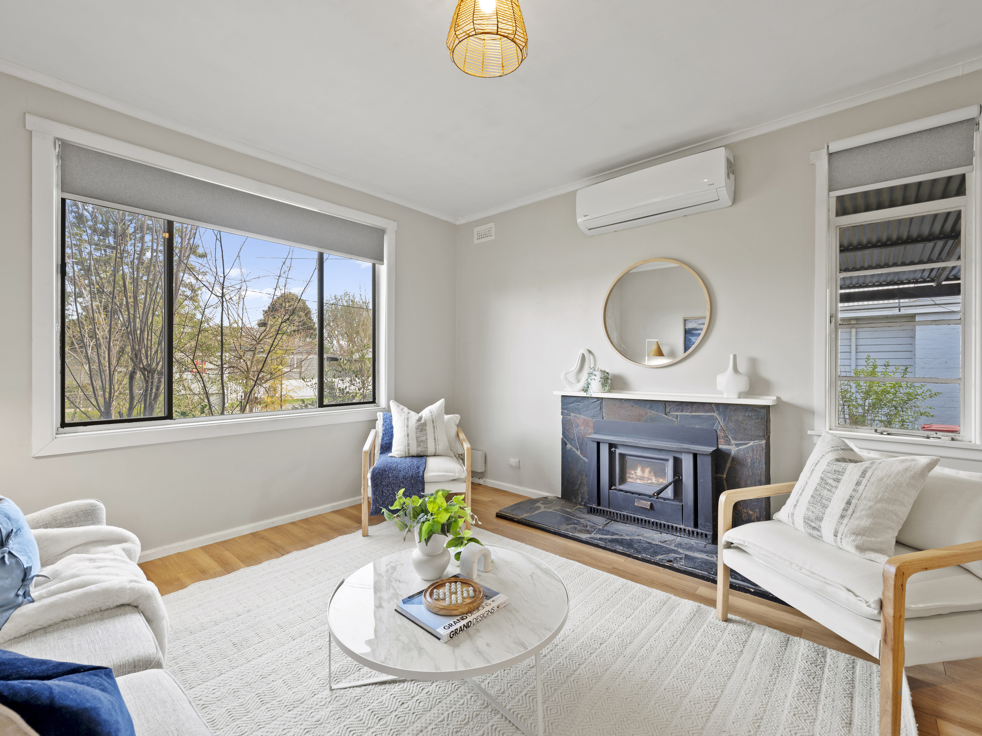 The deck is ideal for year-round gatherings, while a brick-paved patio and fire-pit area create additional spots to relax with family and friends. Inside, the open-plan living and dining zone is warm and welcoming, anchored by a wood fire and supported by reverse-cycle air-conditioning for comfort in every season. A practical laundry and mudroom, complete with a second toilet, adds to the everyday functionality.