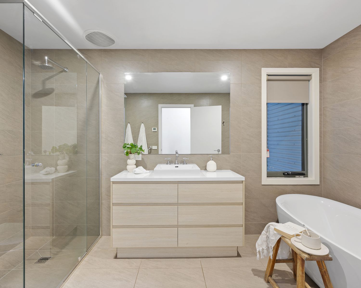 - Central bathroom with freestanding bath, floor-to-ceiling tiles, semi-frameless shower and underfloor heating