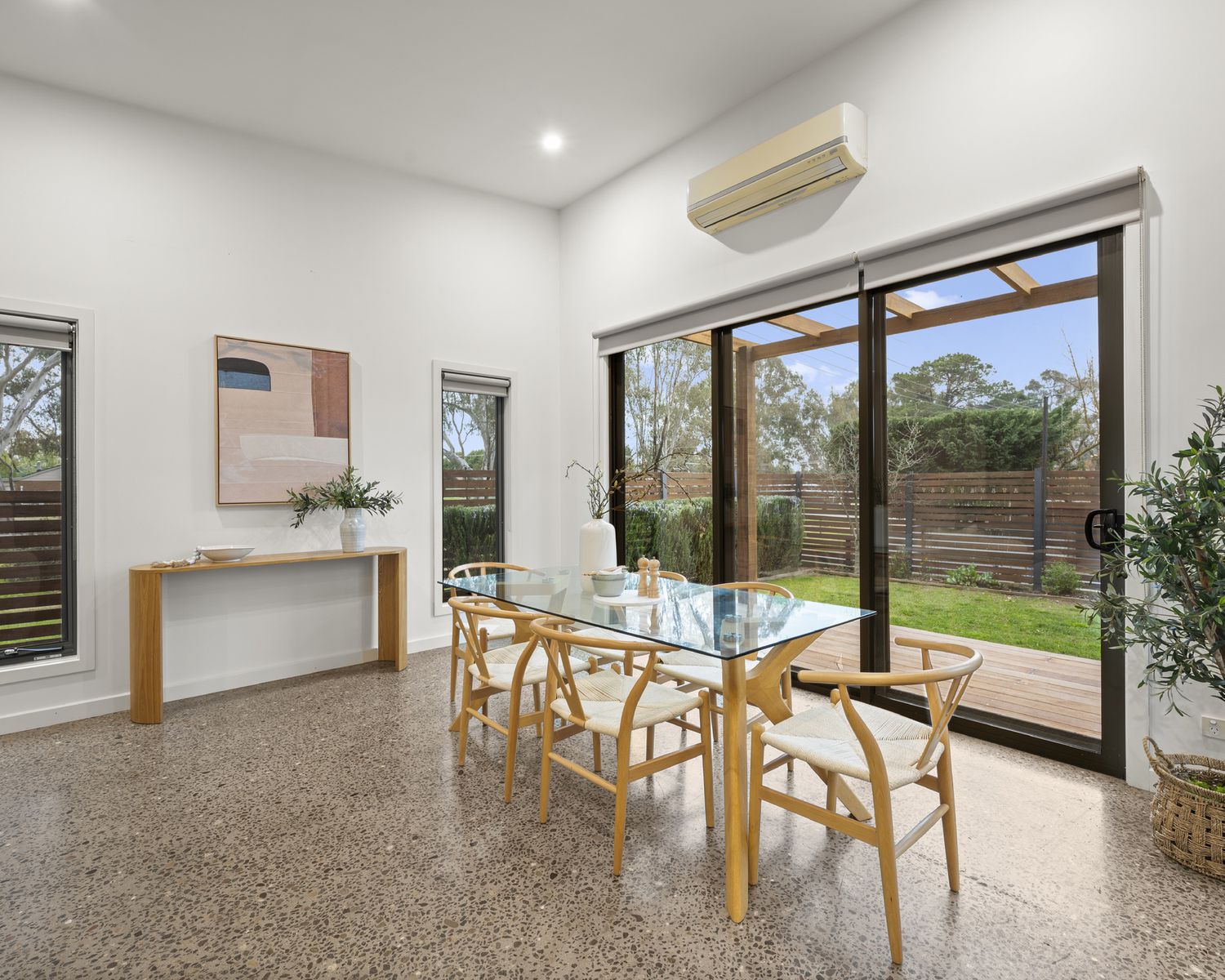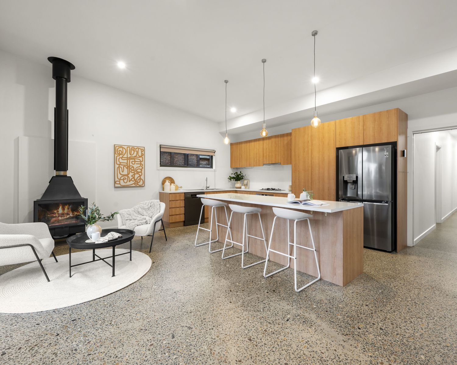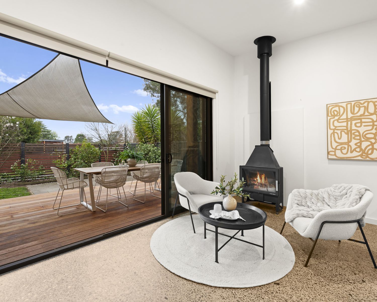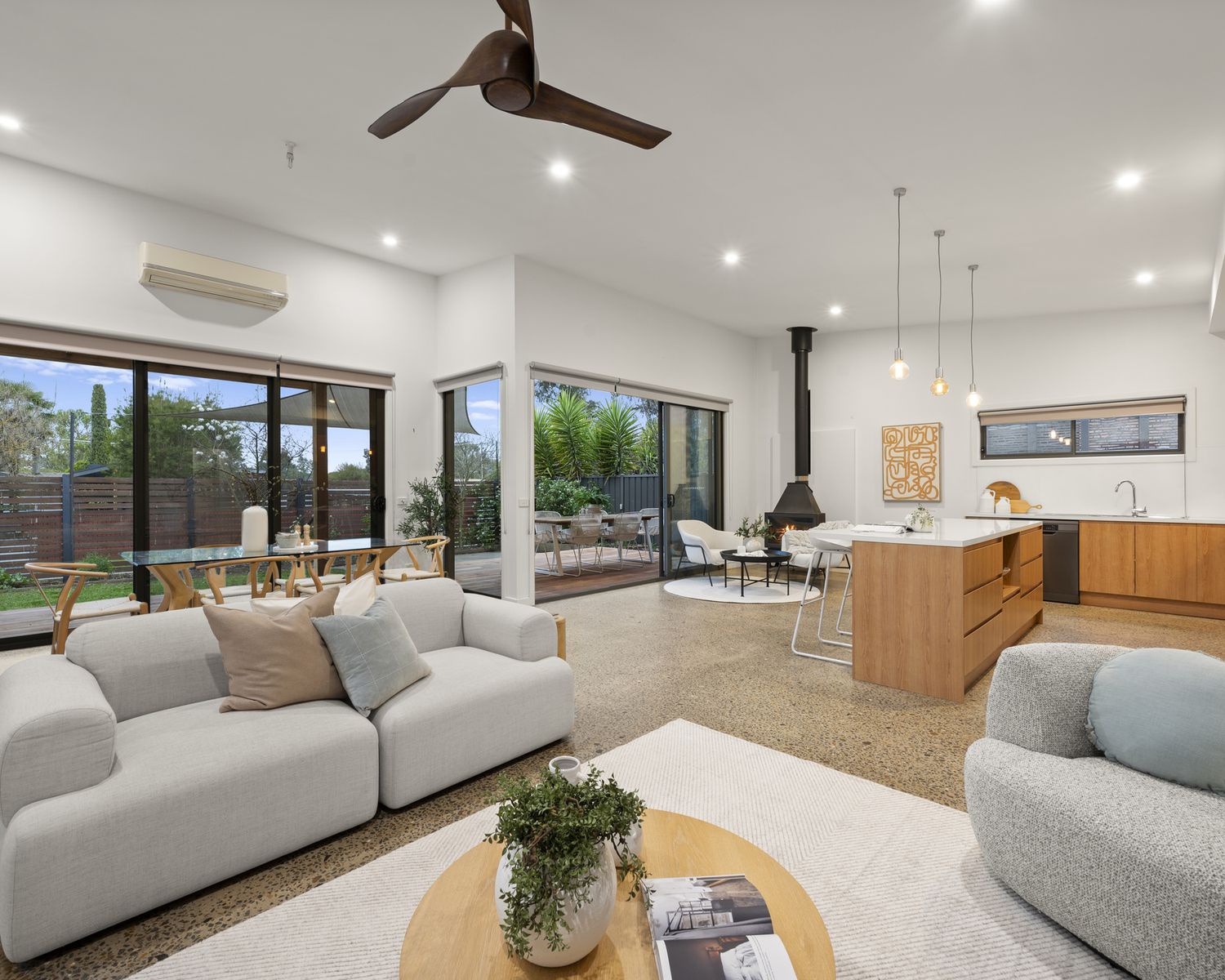 - Open-plan living/dining area with feature stone fireplace and built-in concrete bench seating