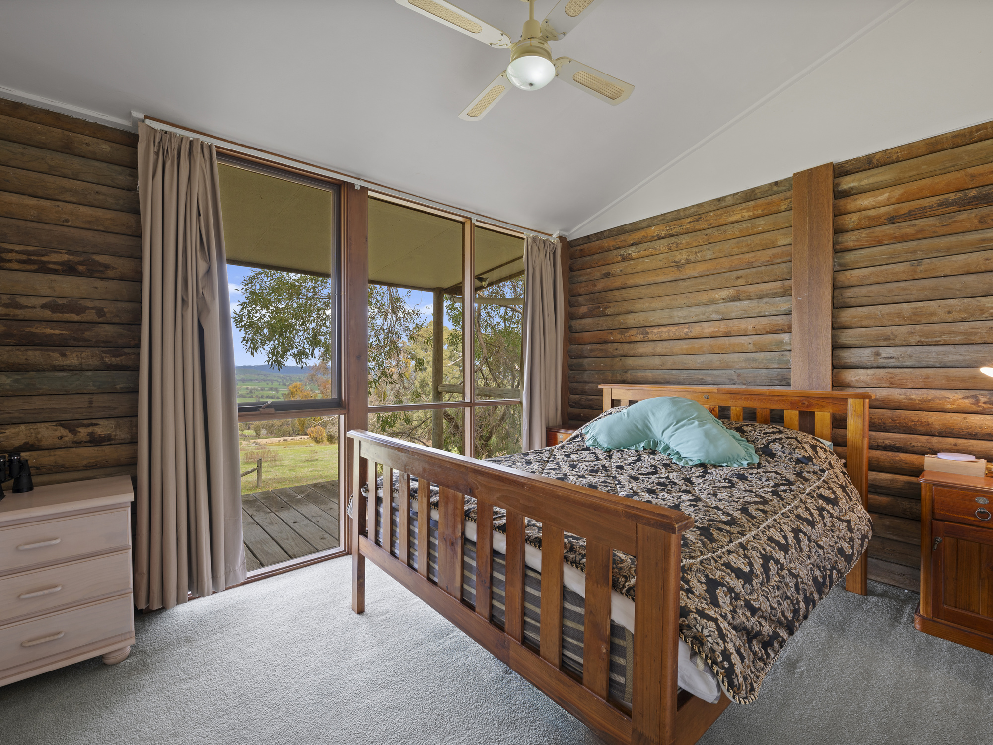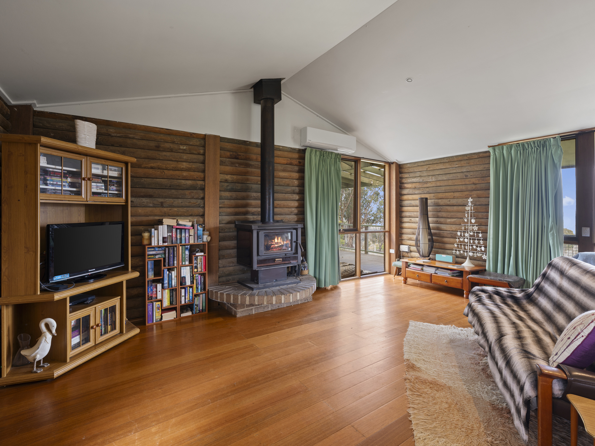 The three-bedroom log home is comfortable and functional, featuring a spacious open-plan living area with timber floors, vaulted ceilings, wood fire and reverse-cycle heating/cooling. Large windows draw in the views, while the wraparound verandah and covered deck provide the perfect vantage point to relax or entertain. The home could benefit from updating, giving buyers scope to add value and personalise.