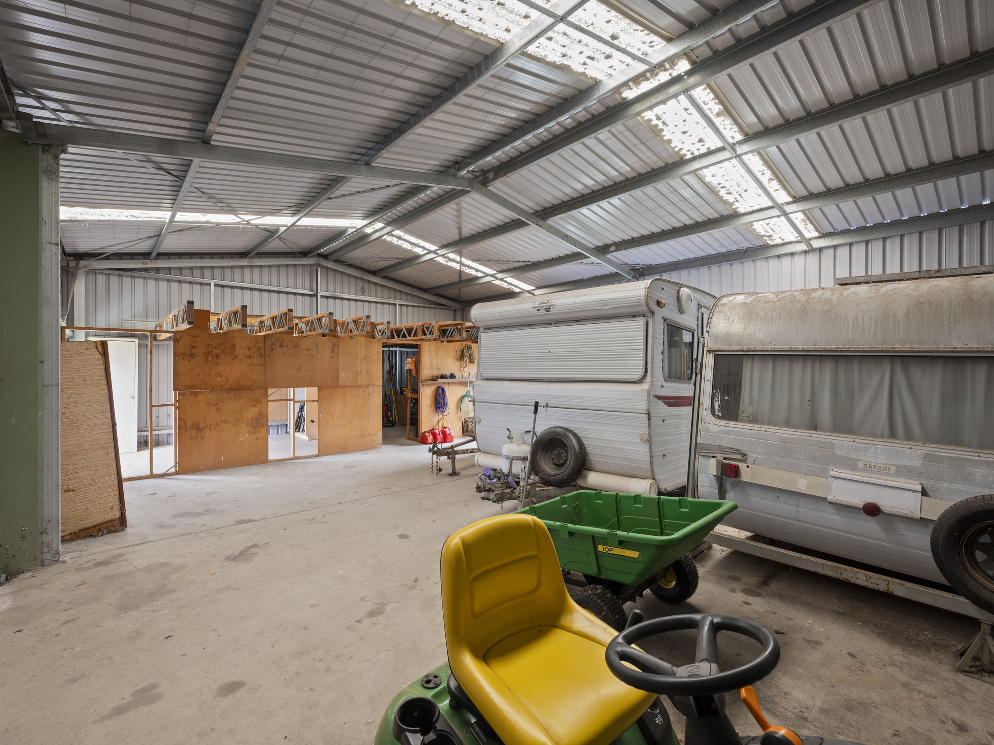 Outside, the land is fully fenced with three dams, water tanks, and established trees providing shelter and privacy. A large shed with concrete floor, power and workbenches offers endless storage and workshop space, while the double carport and caravan add further practicality.