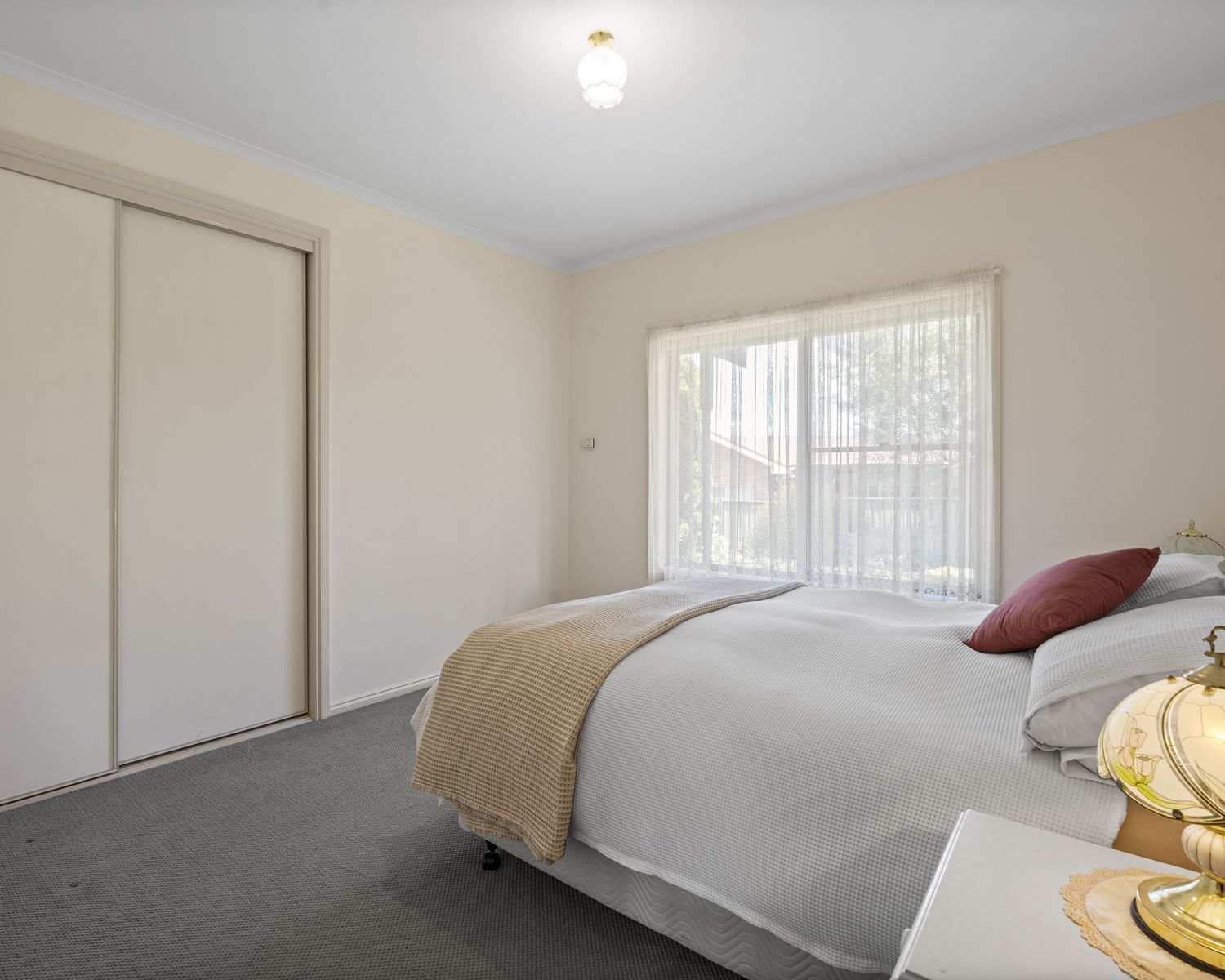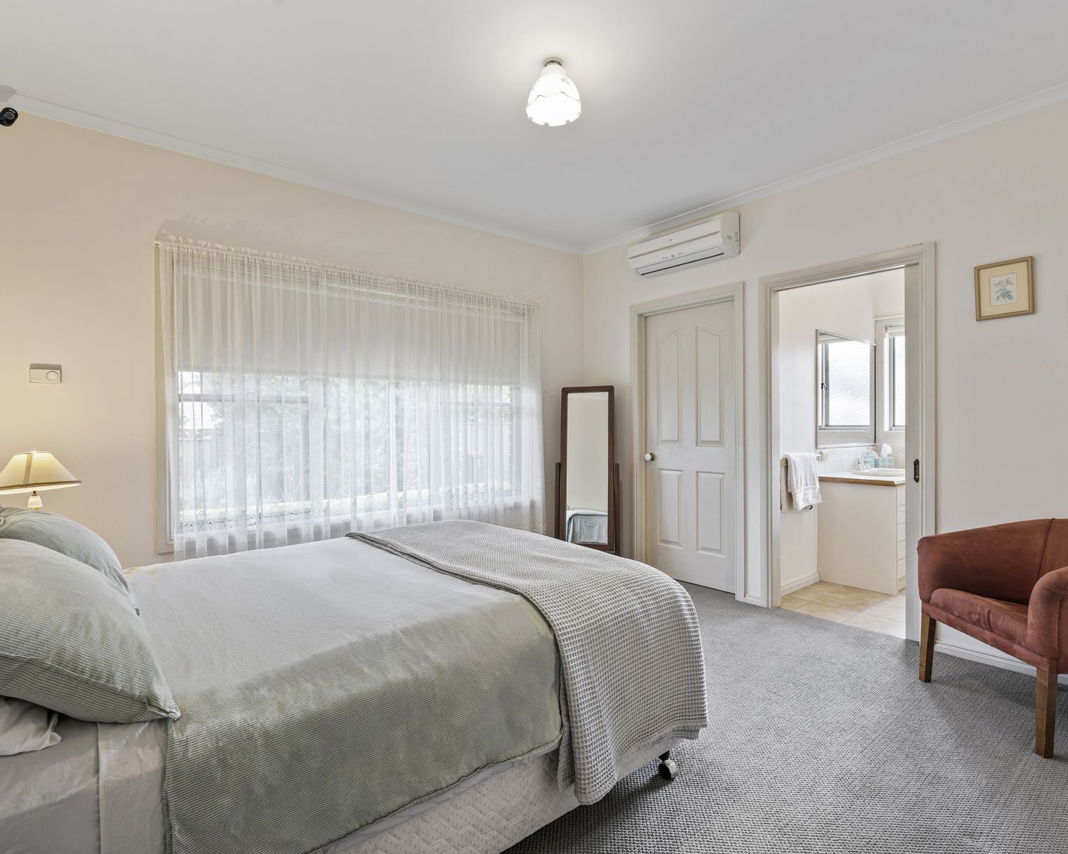 The master bedroom includes an ensuite and walk-in robe, while the remaining bedrooms are serviced by a central bathroom and separate toilet. Fresh carpets and blinds add warmth, and zoned electric floor heating plus split system cooling in the living and master bedrooms ensure year-round comfort.