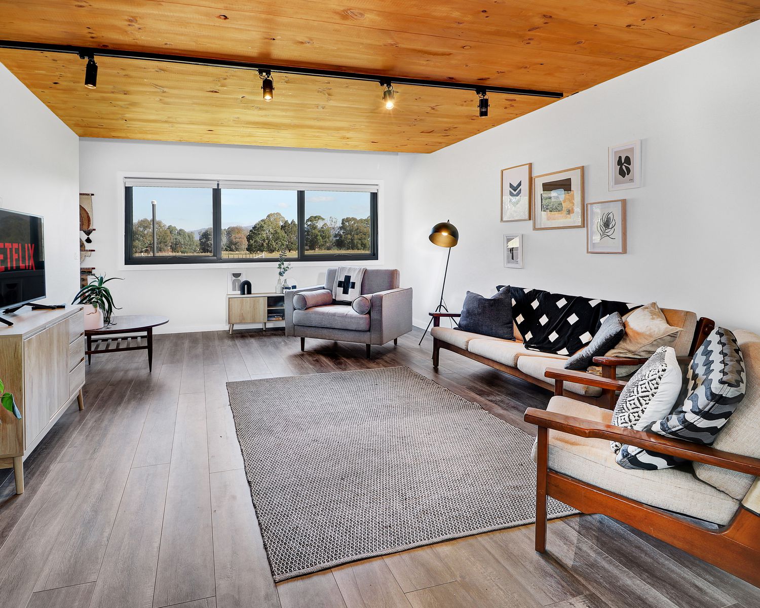 The main living zone features a beautiful stone fireplace and flows effortlessly to outdoor entertaining spaces where you can relax and enjoy the changing colours of the surrounding rural landscape. The sleek kitchen includes a large island bench, quality appliances and an inviting dining area perfect for hosting family and friends.
