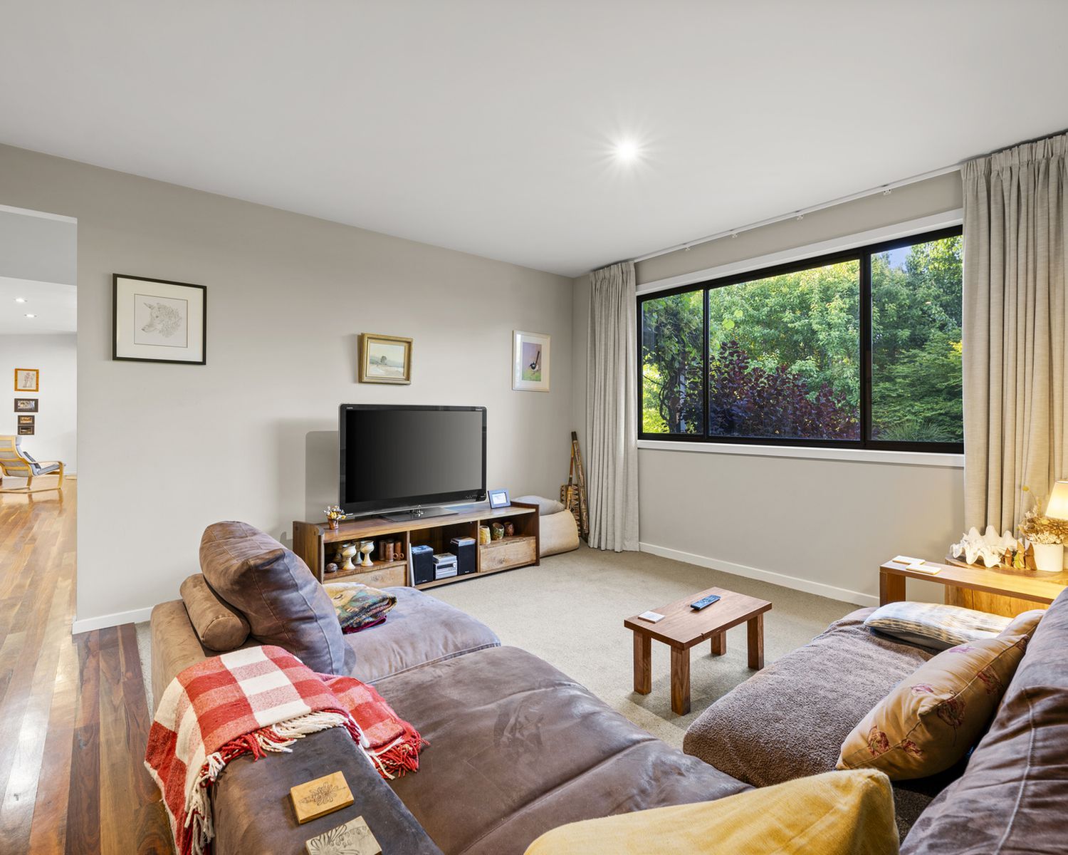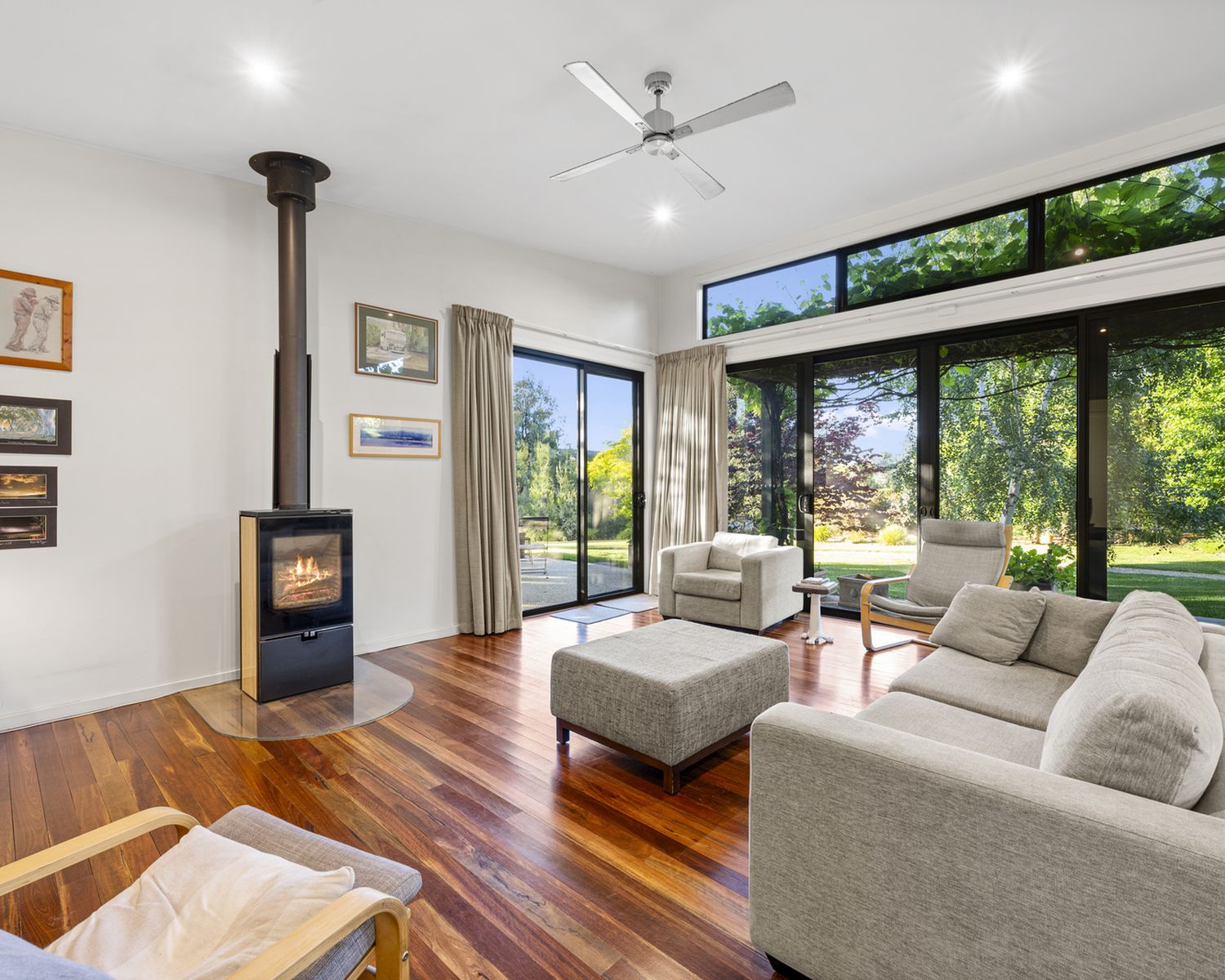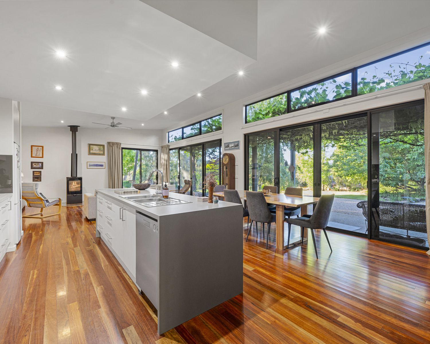 Built by a respected local builder, and architecturally designed by Willick Design, the home is surrounded by established gardens that create a wonderful sense of privacy. The north-facing open-plan kitchen, living and dining area is light-filled and inviting, with views over lush native gardens. Timber floors, extra-high ceilings, a Euro-style wood heater and split system add both comfort and charm.