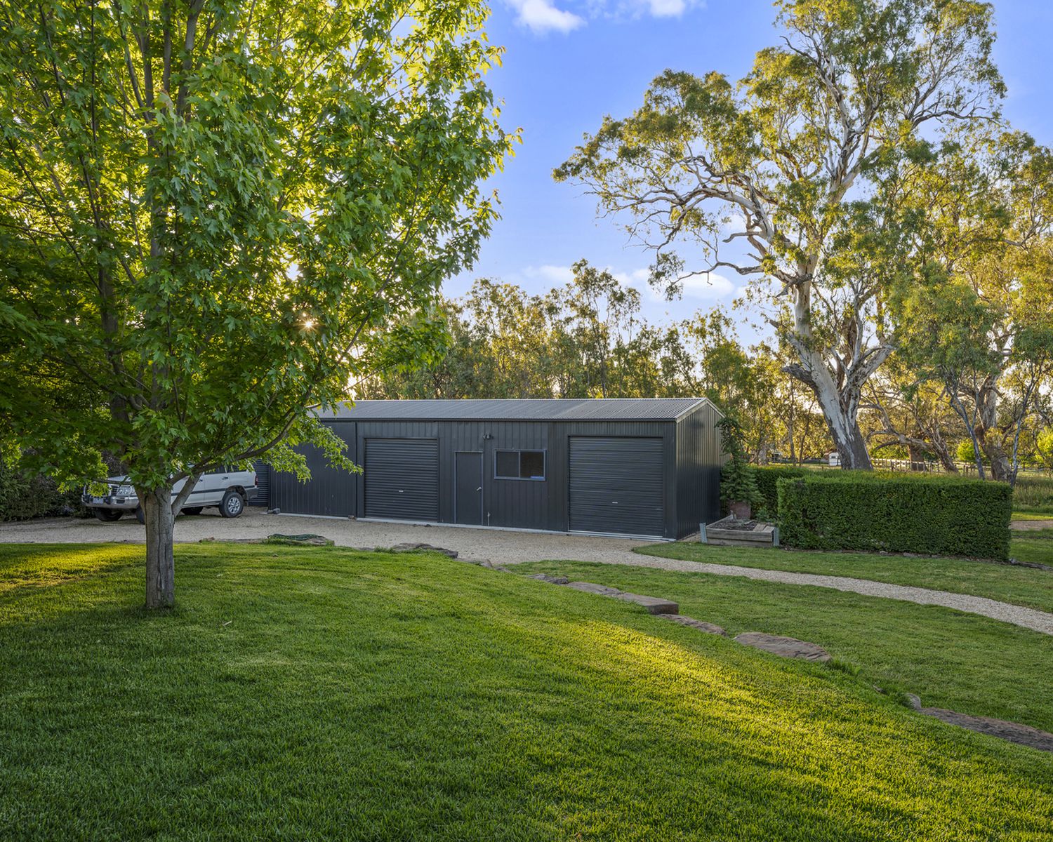 Vechicle storage is well taken care of with a double garage attached to the home, plus a second driveway leads to a three-bay shed with workshop, one bay extra deep to accommodate two vehicles or a longer caravan.