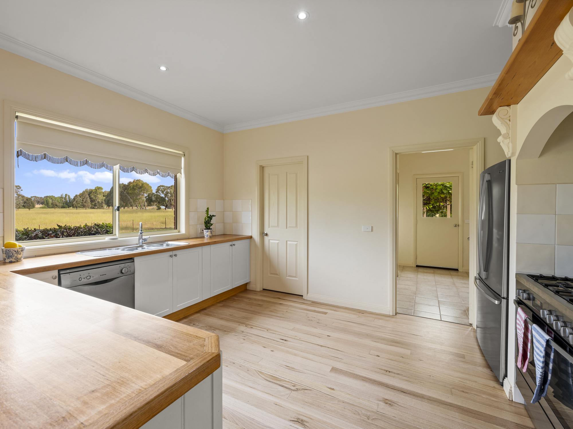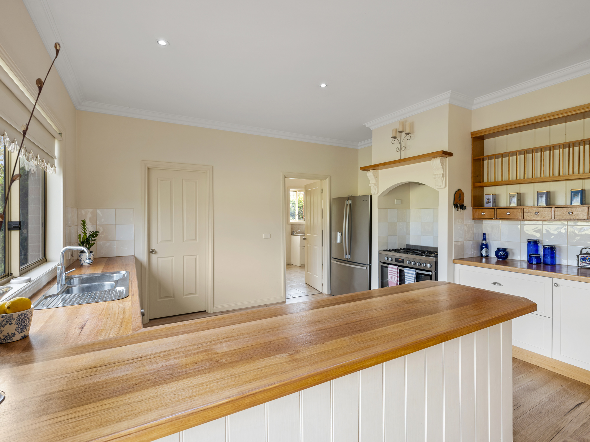 The kitchen is full of charm, with hardwood benchtops, a 900mm freestanding stove and a generous walk-in pantry. It opens directly to a large entertaining deck, ideal for relaxed weekends, gatherings with friends and easy outdoor living.
