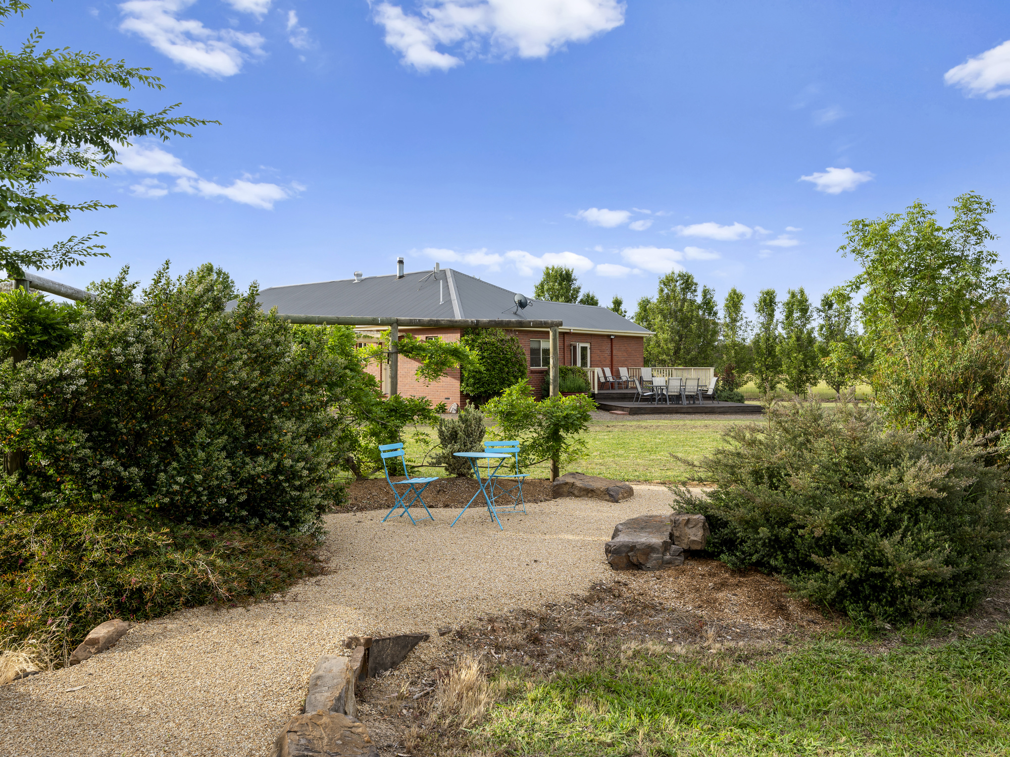 Surrounding the home are a series of thoughtfully landscaped sitting areas, each offering a quiet place to pause and enjoy the established native gardens. Mature trees provide shade and privacy, while seasonal plantings including a flourishing wisteria vine and beautiful roses add colour and softness to the setting, creating an inviting connection between the home and its grounds.